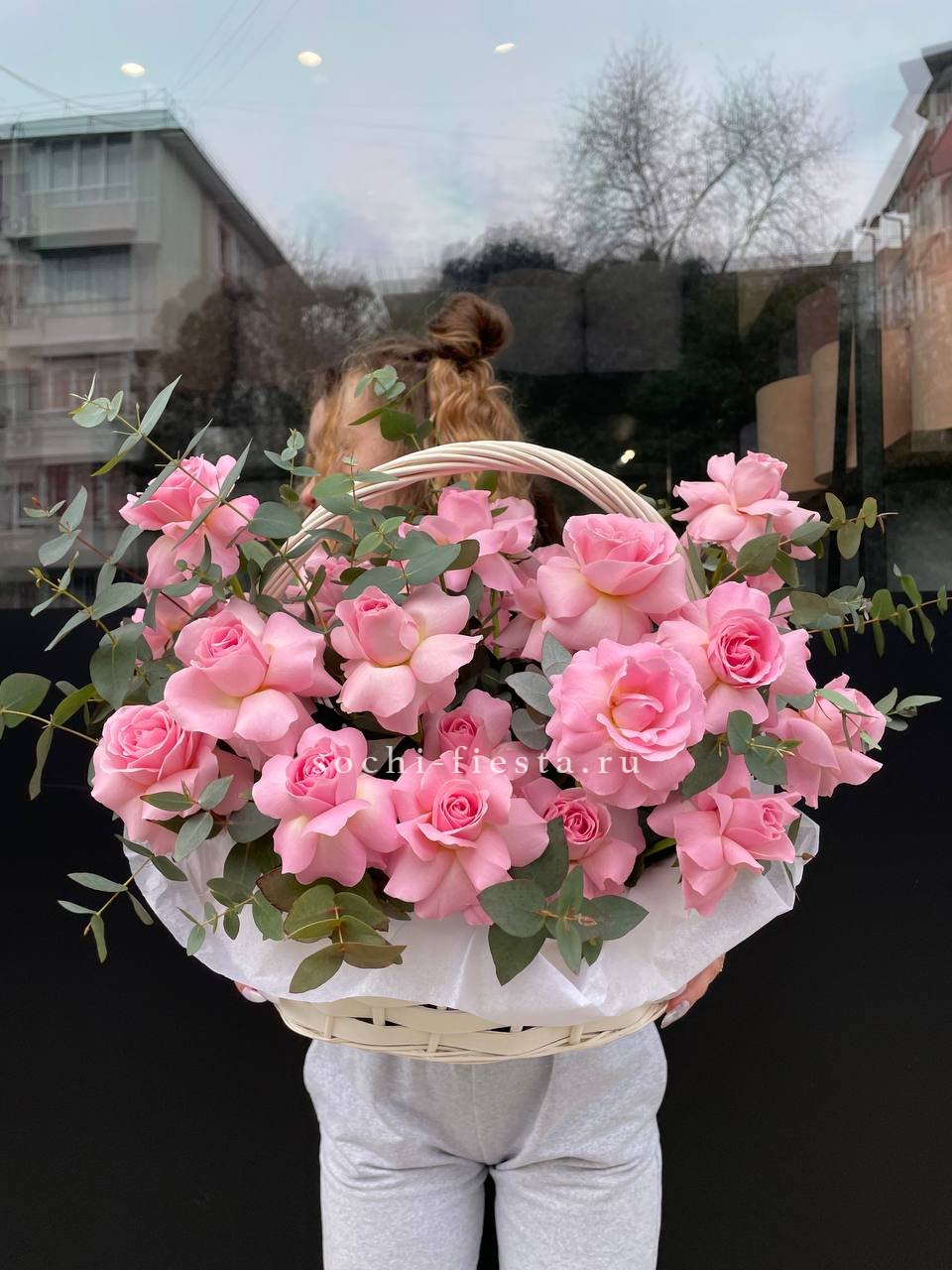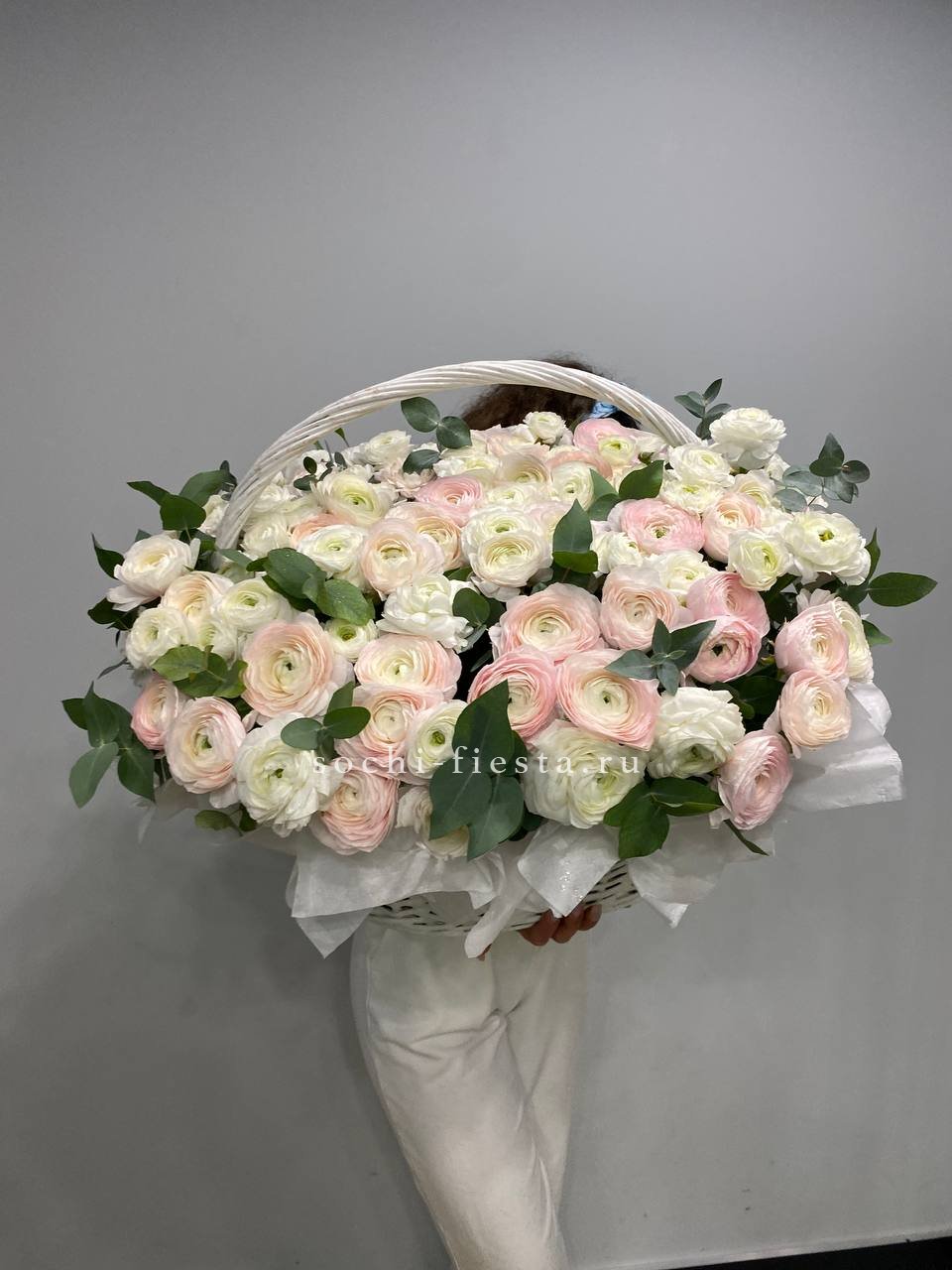Пышная корзина объединяет пионовидные розы с воздушной гортензией и многослойной эустомой. Матиолла и лимониум добавляют глубину композиции, а диантус создает мягкие переходы между крупными бутонами.