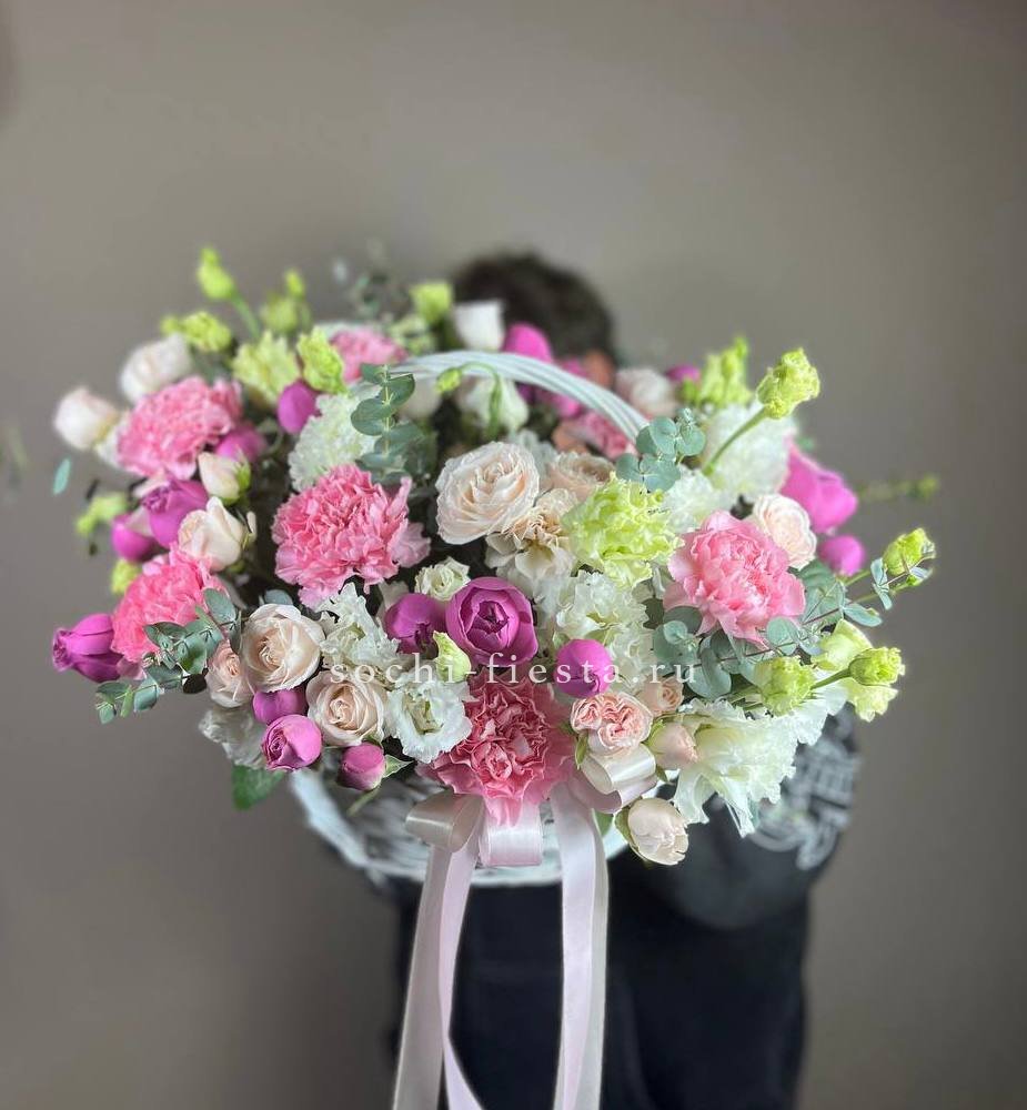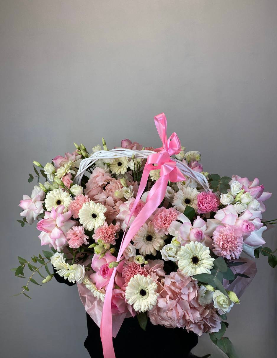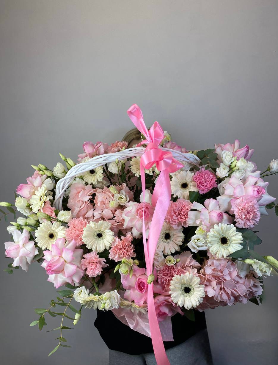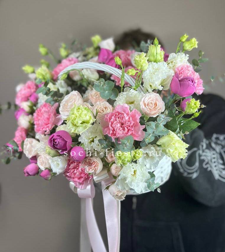 Пышные пионовидные розы Мисти Баблс и бомбастик создают объёмное облако в естественной плетёной корзине. Диантусы и статица добавляют воздушности, а эвкалипт завершает композицию свежими нотами. Яркое присутствие в любом пространстве.