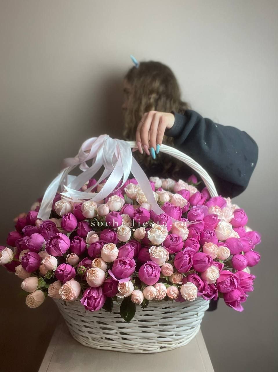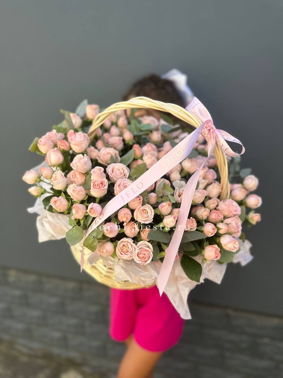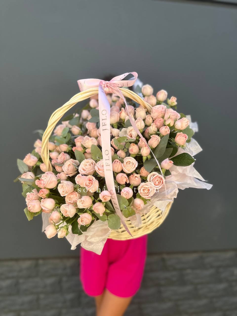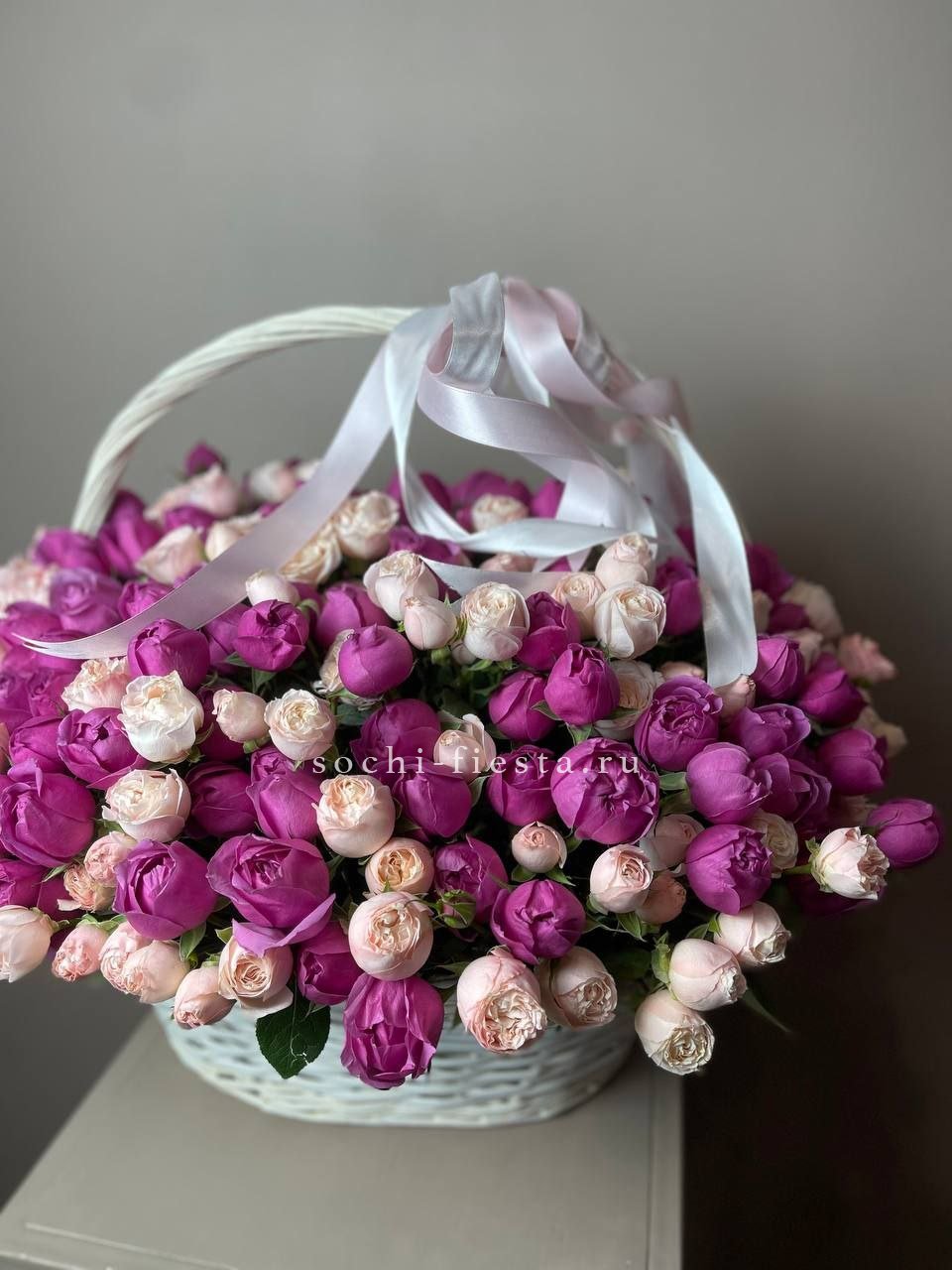 Двадцать пять французских роз с крупными бутонами и бархатистыми лепестками уложены в плетёную корзину. Натуральная основа придаёт композиции домашнее тепло и завершённость формы.