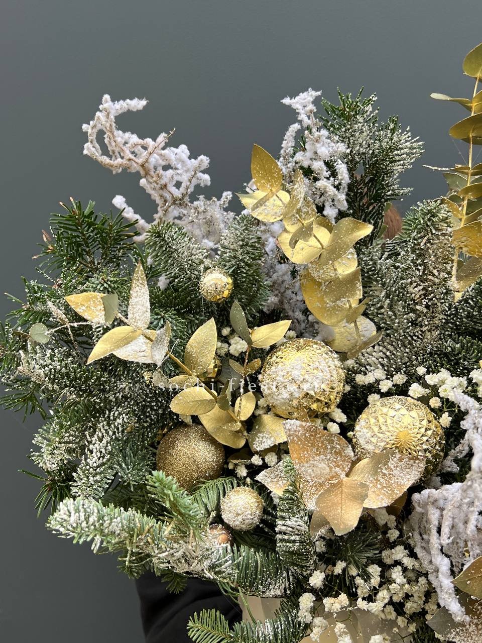 Датский нобилис и ель образуют основу праздничной композиции в кашпо. Свеча и ёлочные игрушки дополняют образ, создавая готовое решение для новогоднего интерьера.