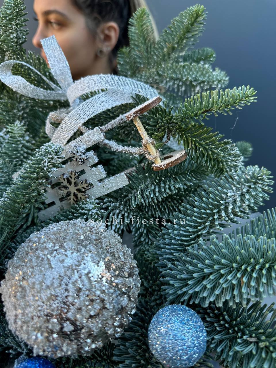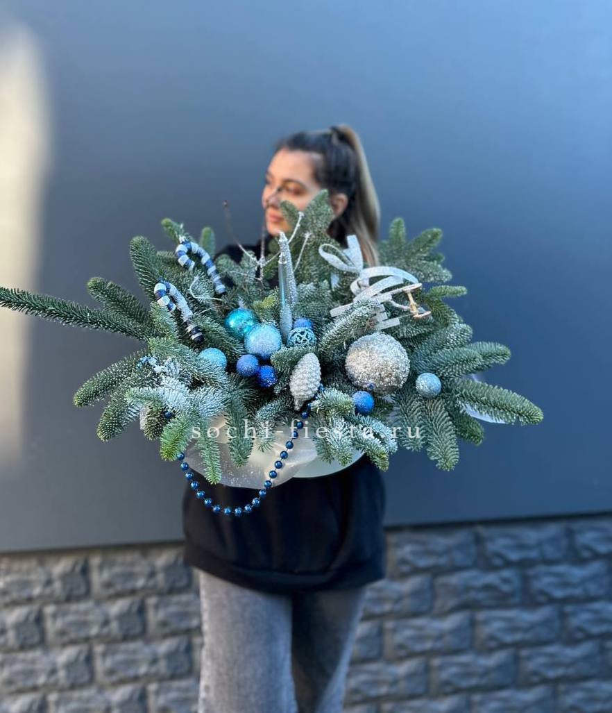 Ветви датского нобилиса плотно уложены в коробку и дополнены яркими игрушками. Компактная композиция удобна для размещения на полке или рабочем столе и сохраняет свежесть долгое время.