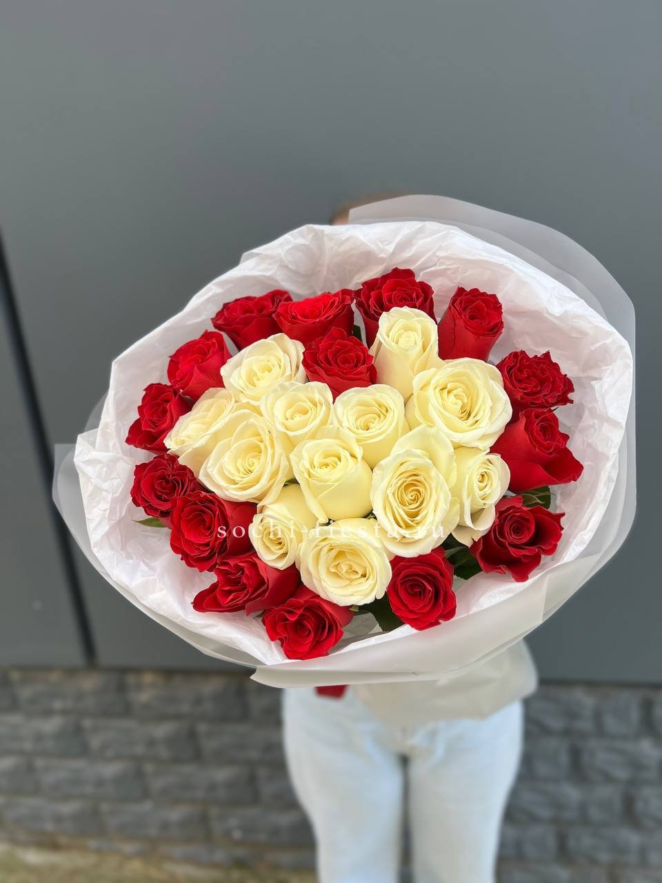 55 роз белого и розового оттенков или же с добавлением кремовой розы, лента, упаковка.
