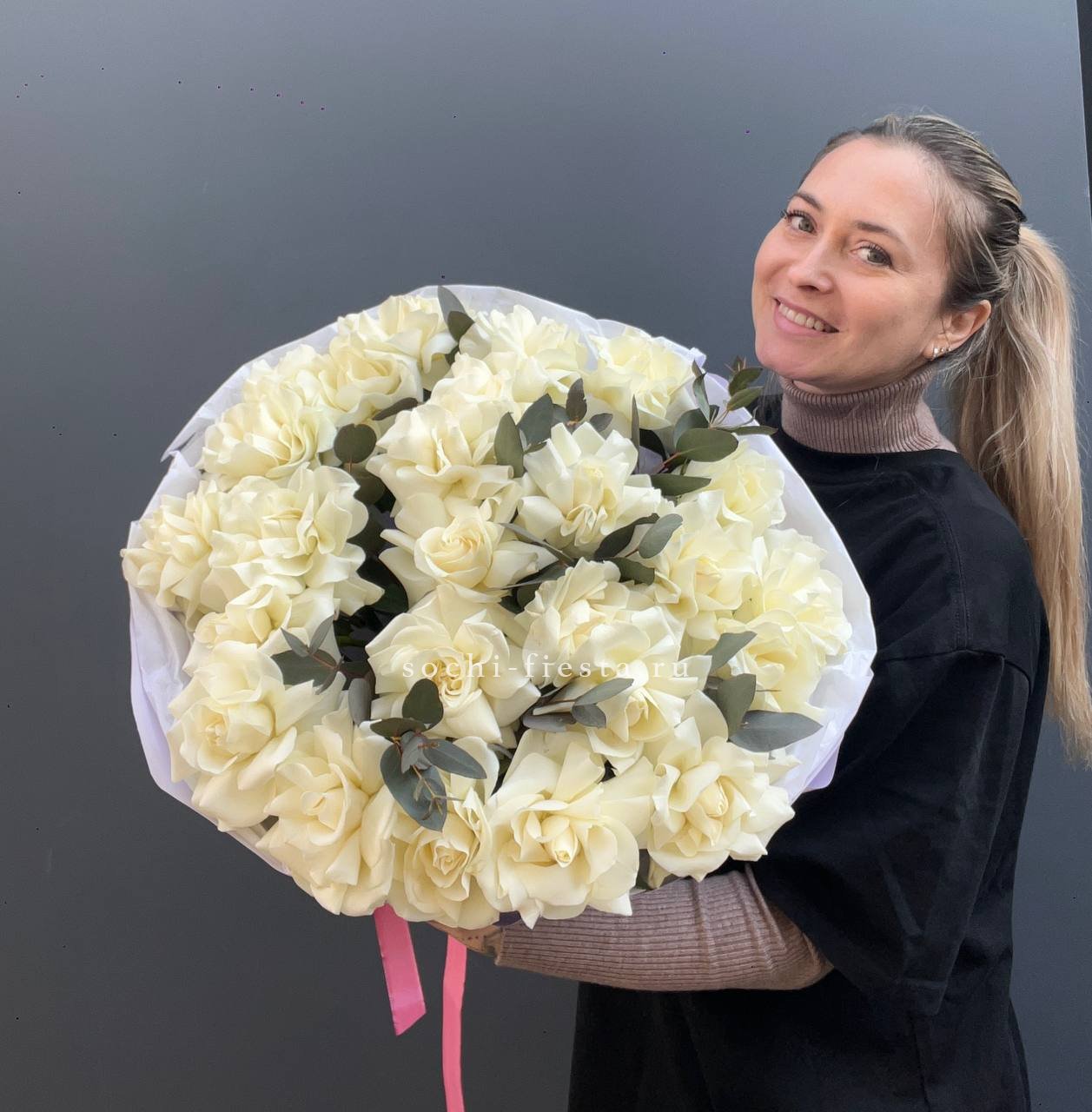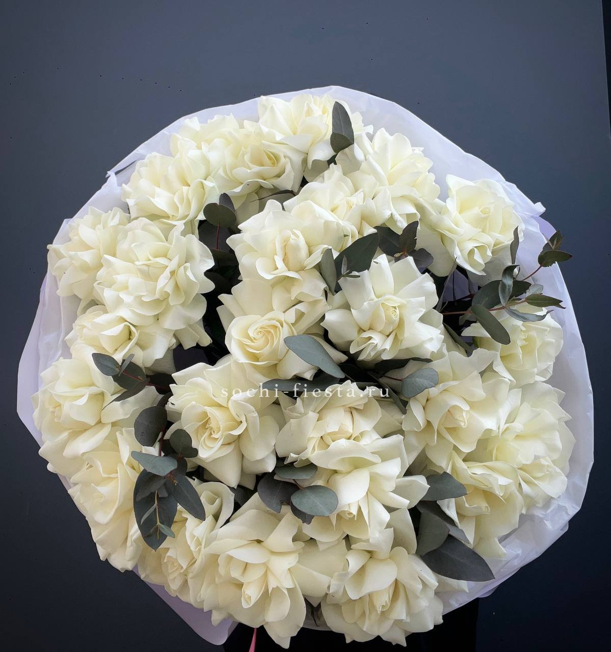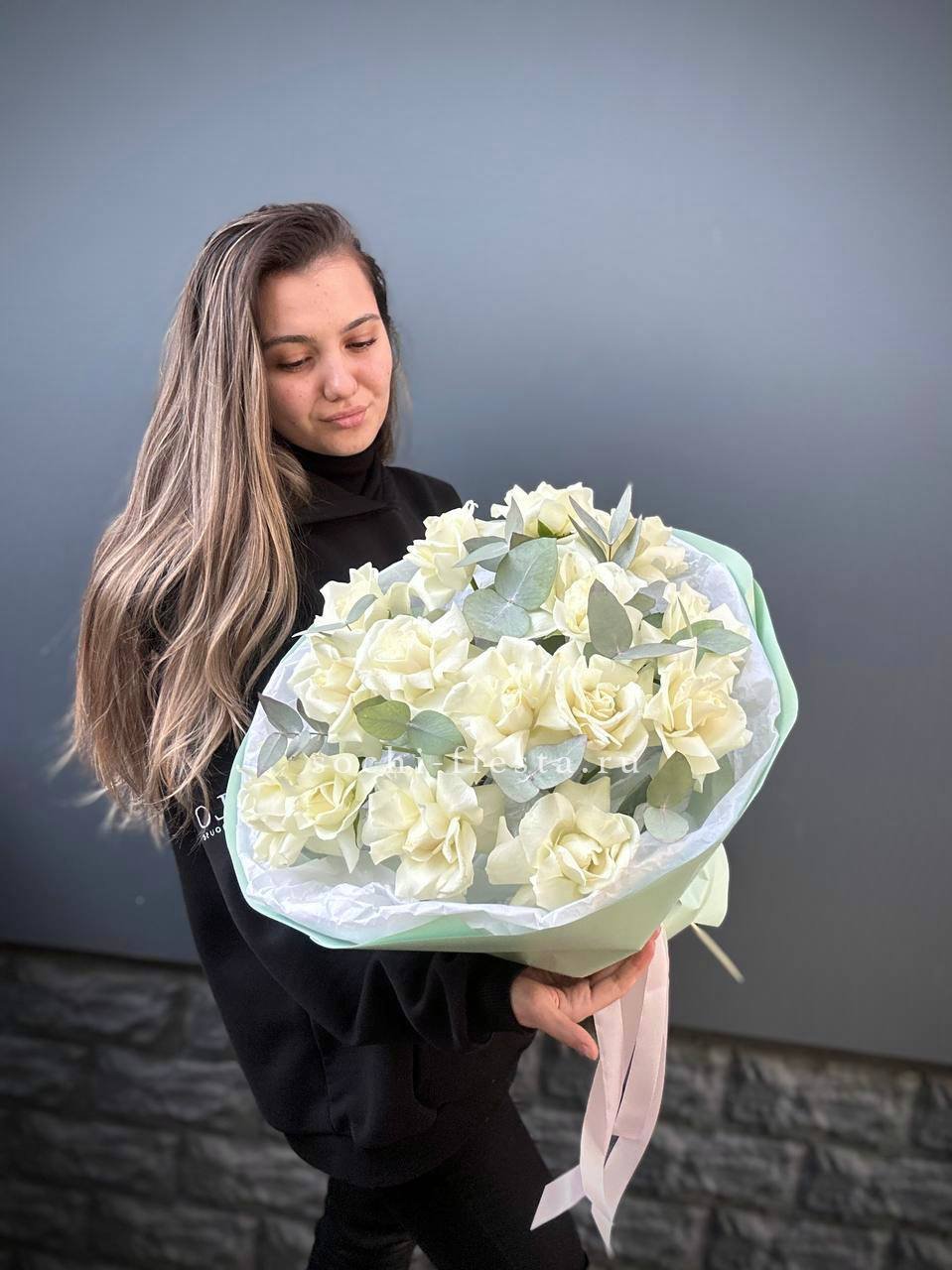 Французские розы Notte Bianca раскрываются широкими вывернутыми бутонами с фактурной глубиной. Эвкалипт добавляет графичности и подчёркивает архитектуру каждого цветка.