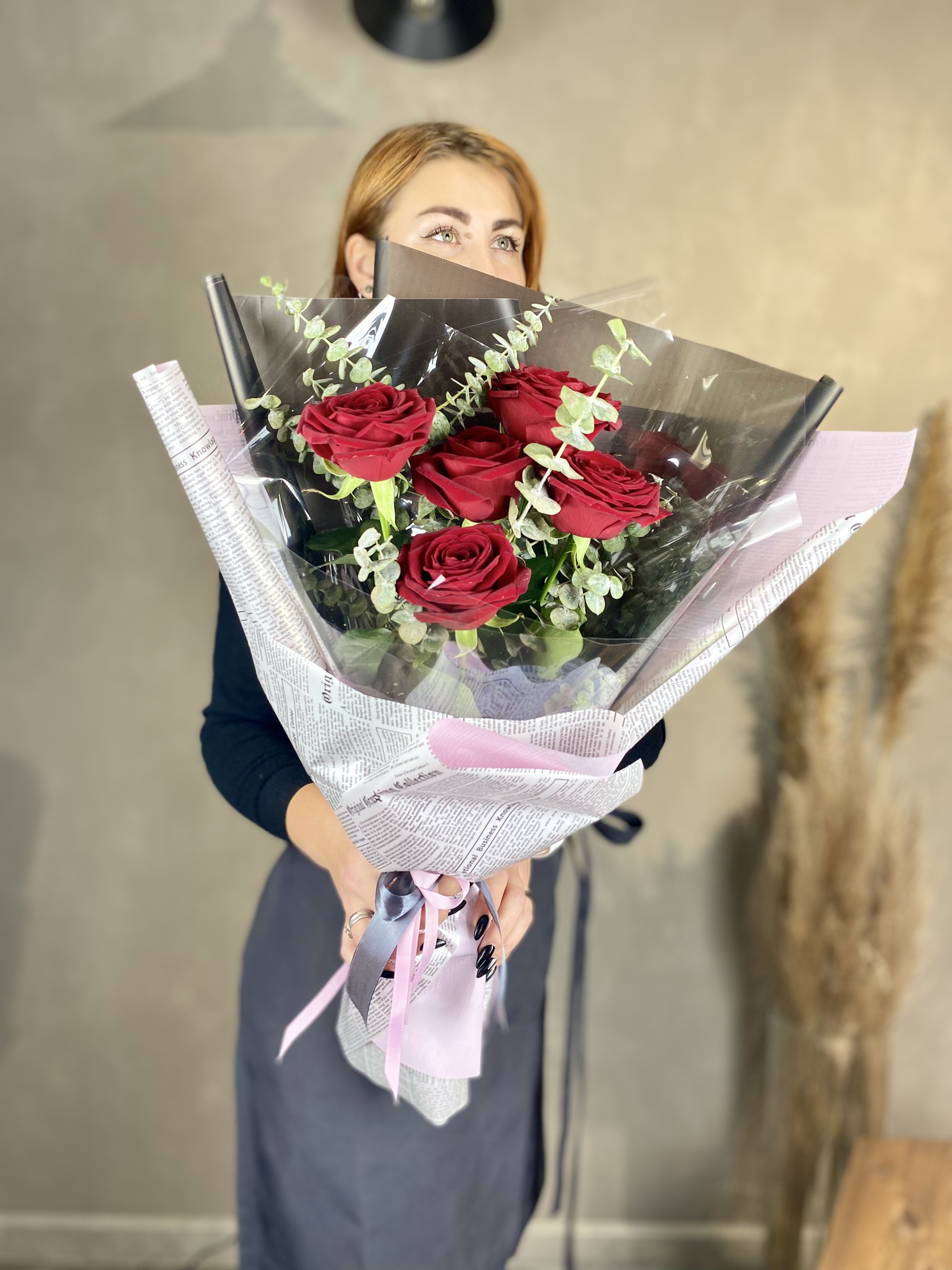 5 красных роз, эвкалипт, лента, дизайнерская пленка.