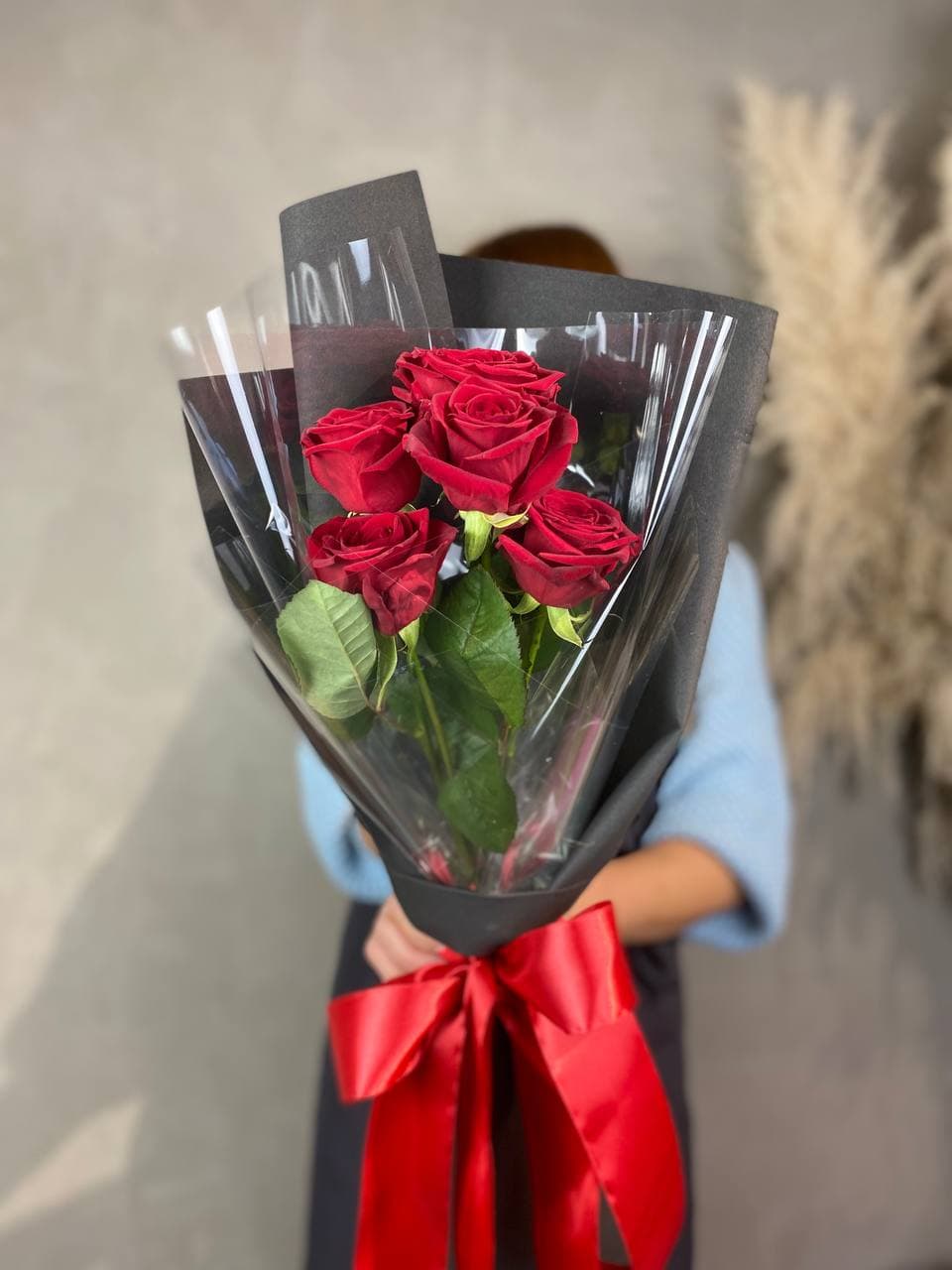 5 красных роз, лента, дизайнерская пленка.