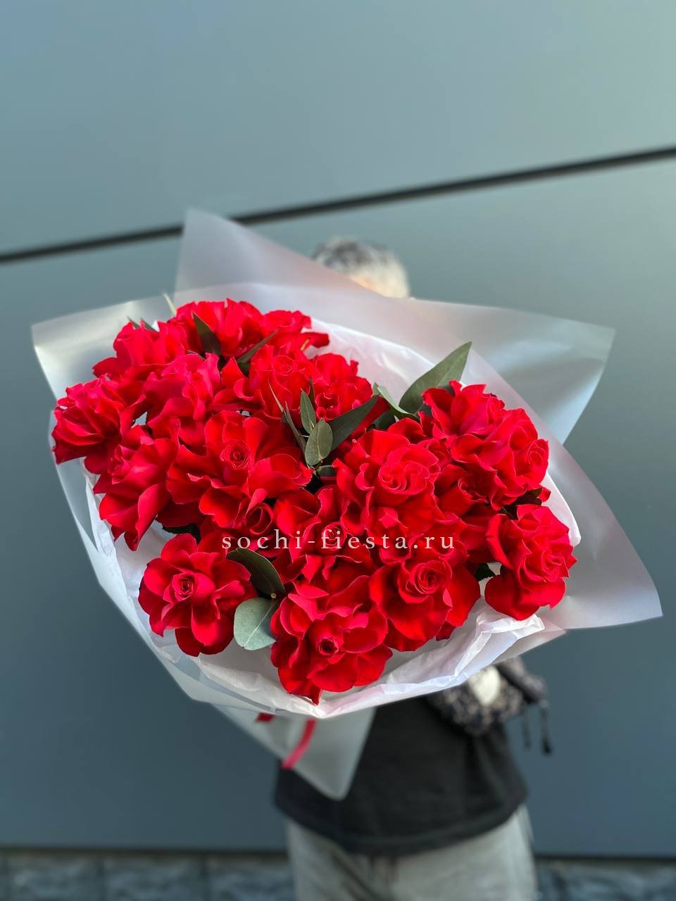 французские розы - 11 шт., эвкалипт-1шт, лента, авторская упаковка.