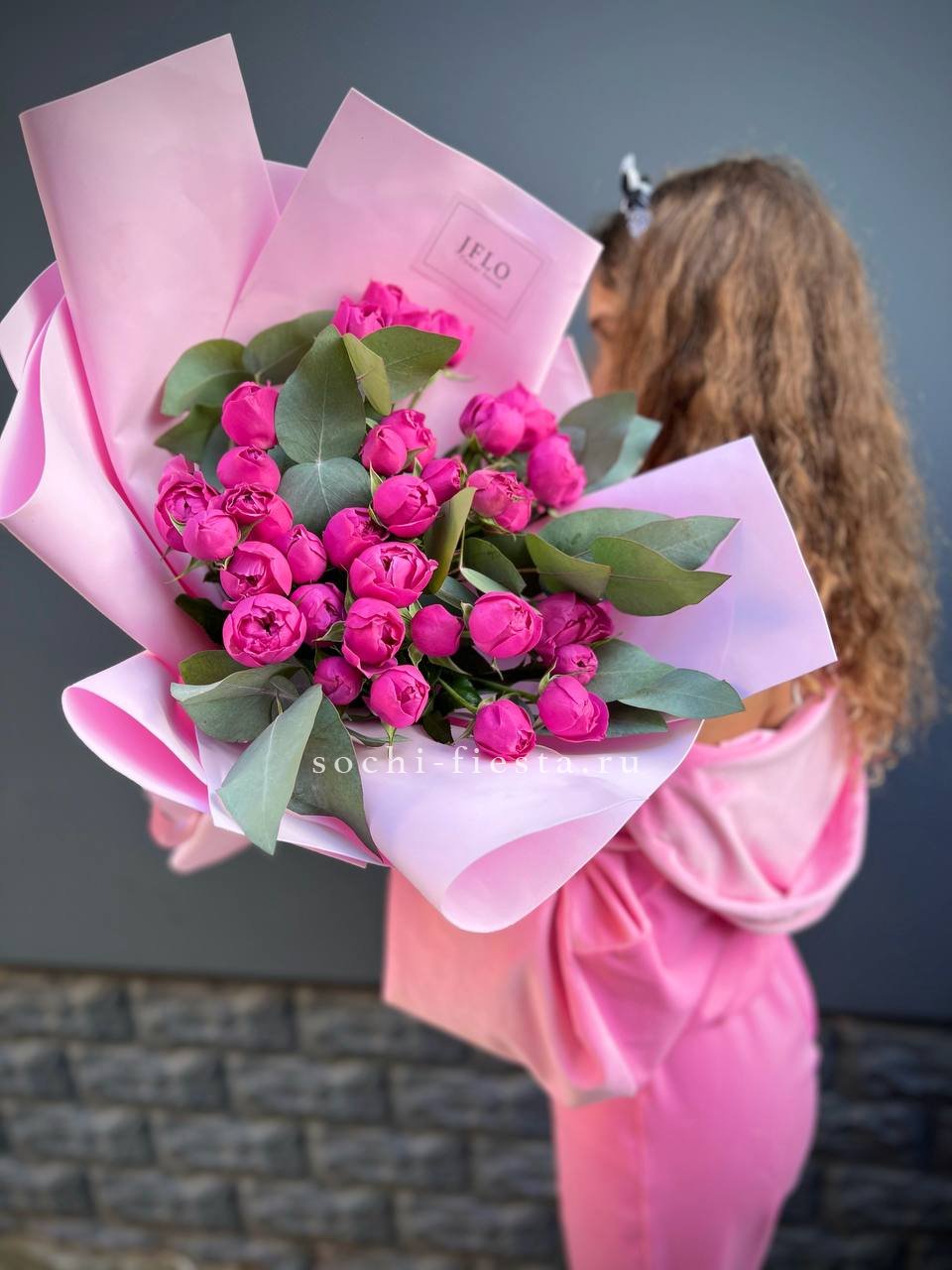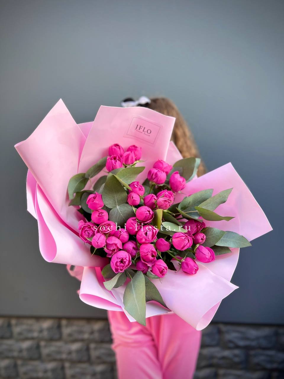 Пятнадцать пионовидных роз Pink X-Pression дополнены ветками эвкалипта с серебристой листвой. Зелень оттеняет розовые бутоны и добавляет свежести всей композиции.
