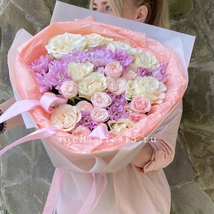 Основа сборных букетов в Вологде: розы (Freedom, Mondial, Avalanche), хризантема кустовая, альстромерия, эустома, фрезия, вероника. Дополнительно — ранункулюсы в сезон, хризантема одиночная, ирис весной, тюльпаны в апреле. Состав зависит от текущей поставки и сезона. Флорист всегда предлагает то, что в лучшей форме прямо сейчас.