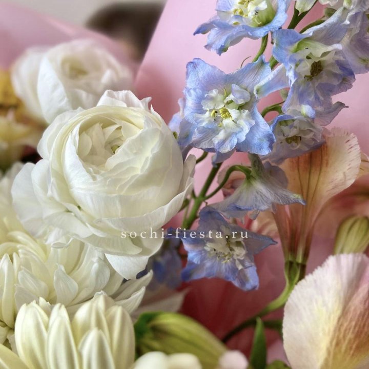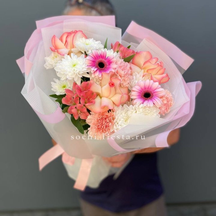 Основа сборных букетов в Вологде: розы (Freedom, Mondial, Avalanche), хризантема кустовая, альстромерия, эустома, фрезия, вероника. Дополнительно — ранункулюсы в сезон, хризантема одиночная, ирис весной, тюльпаны в апреле. Состав зависит от текущей поставки и сезона. Флорист всегда предлагает то, что в лучшей форме прямо сейчас.