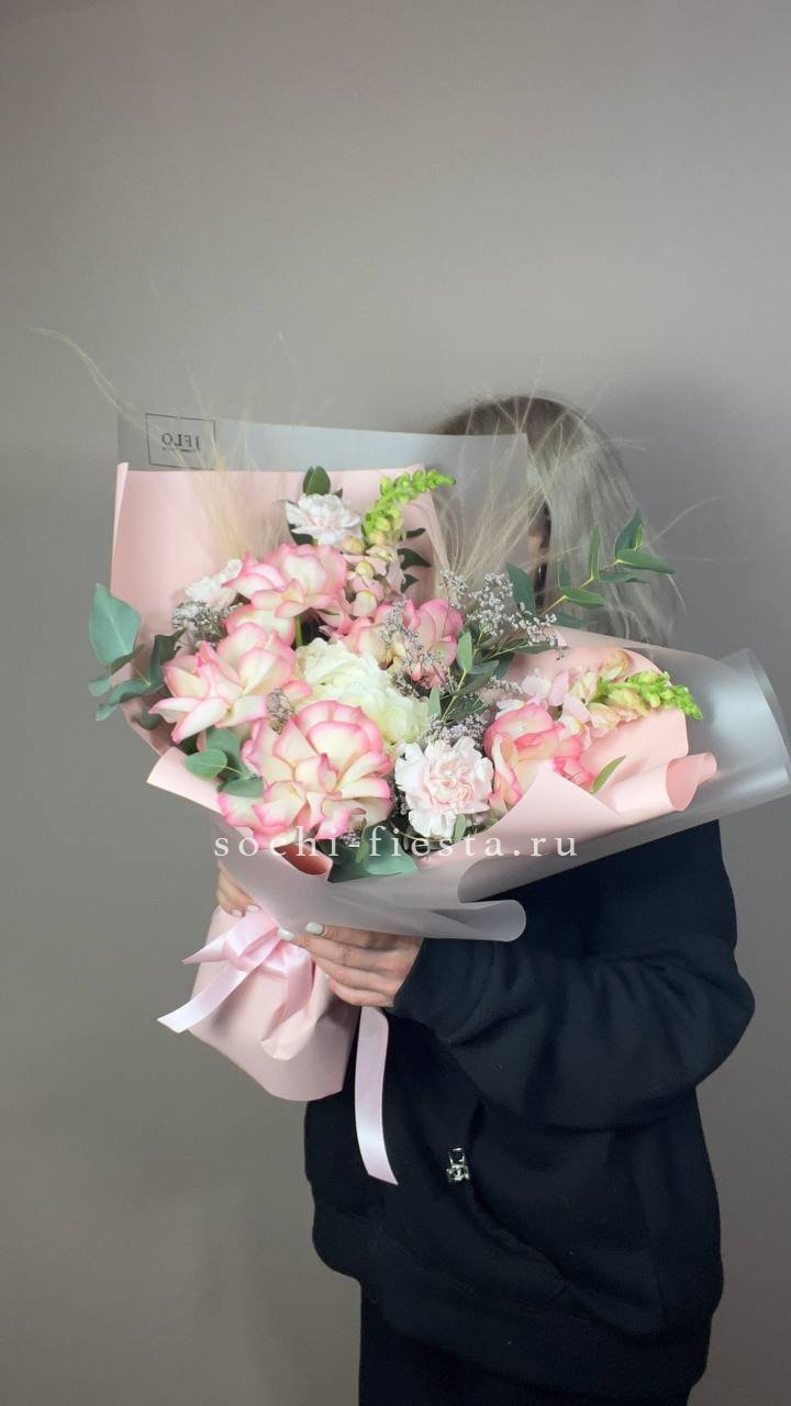 Воздушная композиция в кремовых и белых тонах собрана из нескольких видов цветов с разной формой бутонов. Эустома и диантусы создают мягкую текстуру, а кустовые розы добавляют объём и завершённость силуэту.