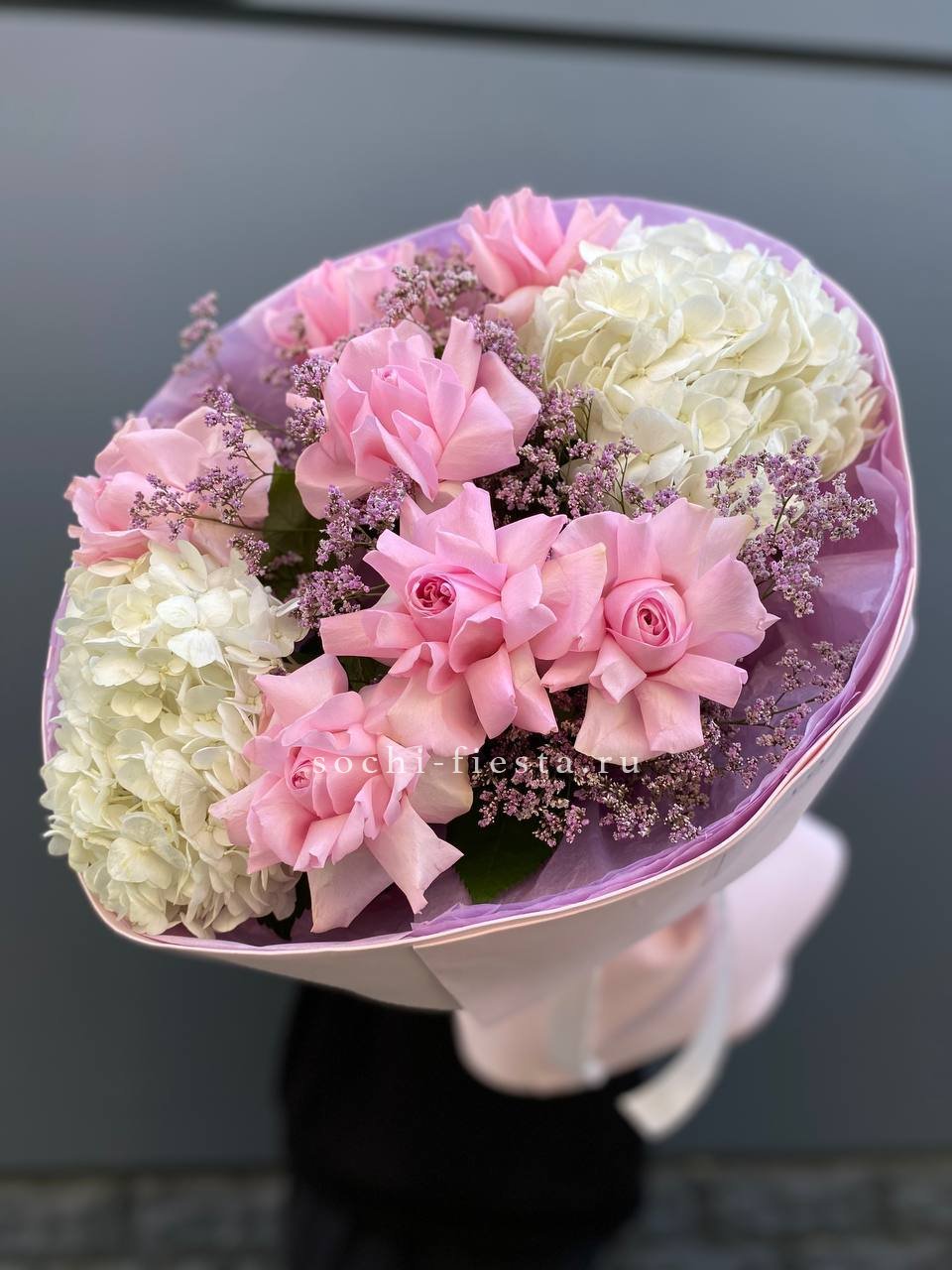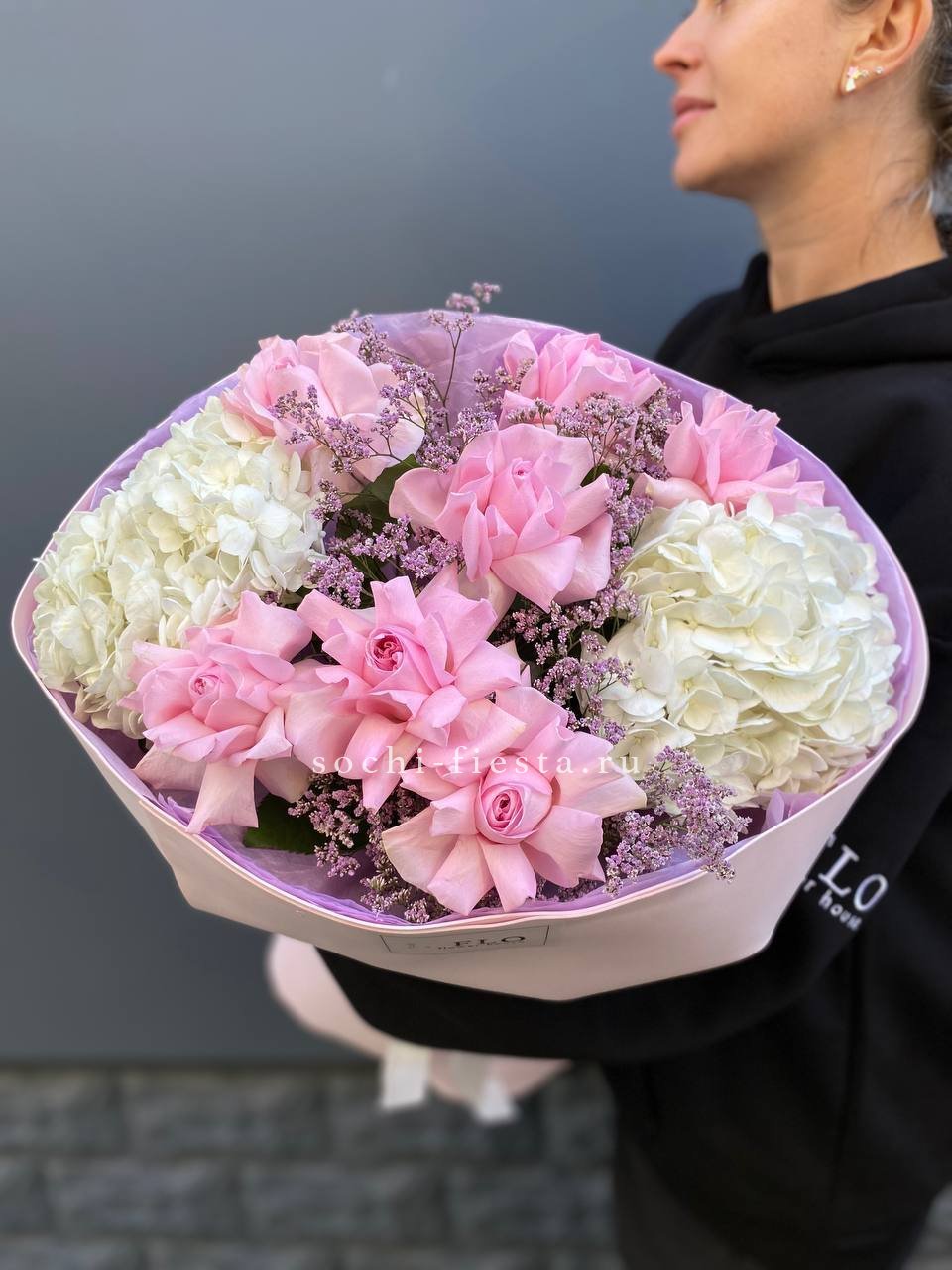 маттиола, розы, гортензия, диантусы, хризантемы , лента и дизайнерская пленка.