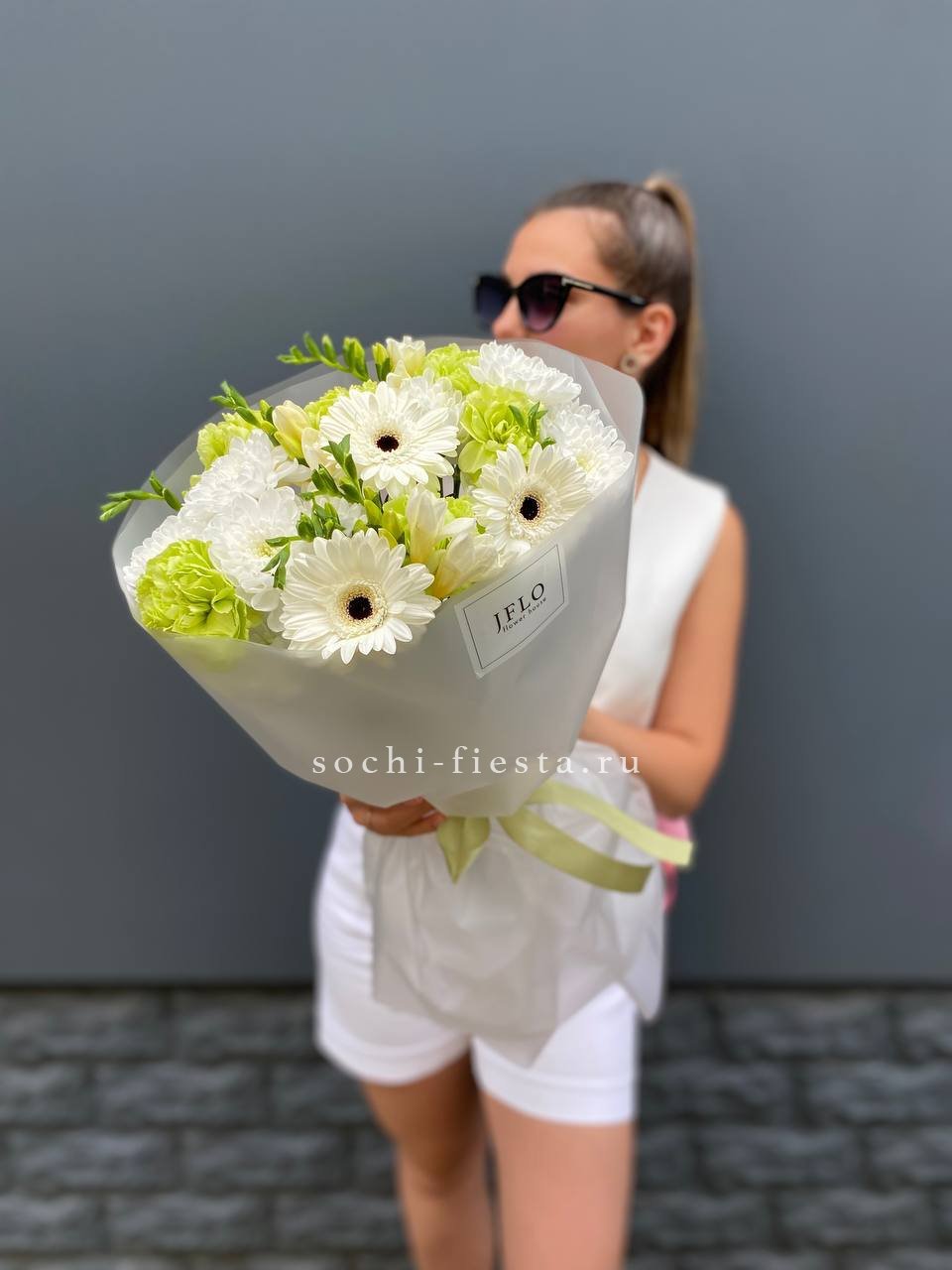 гортензия, герберы,  фрезии, диантусы, хризантемы , лента и дизайнерская пленка.