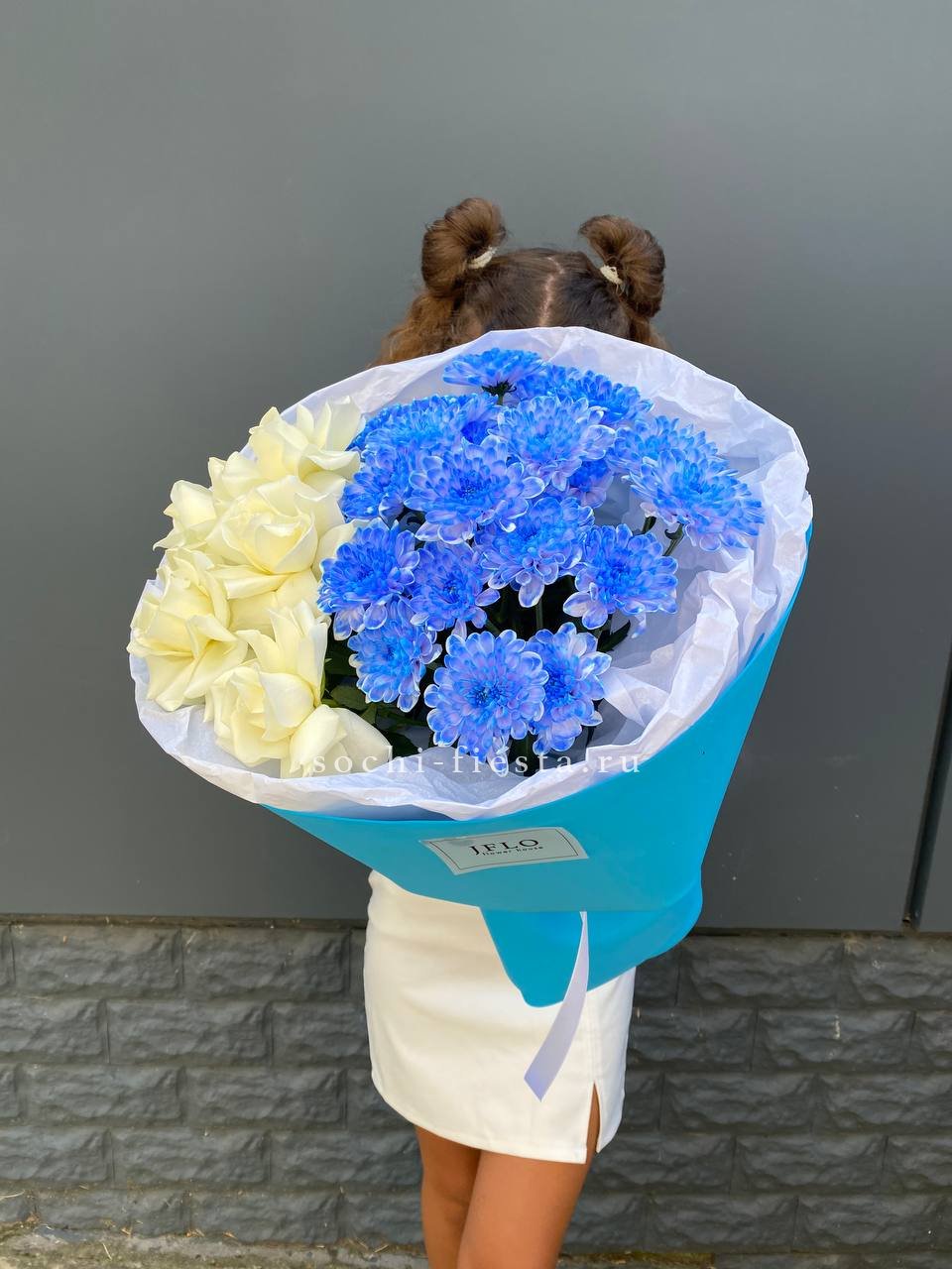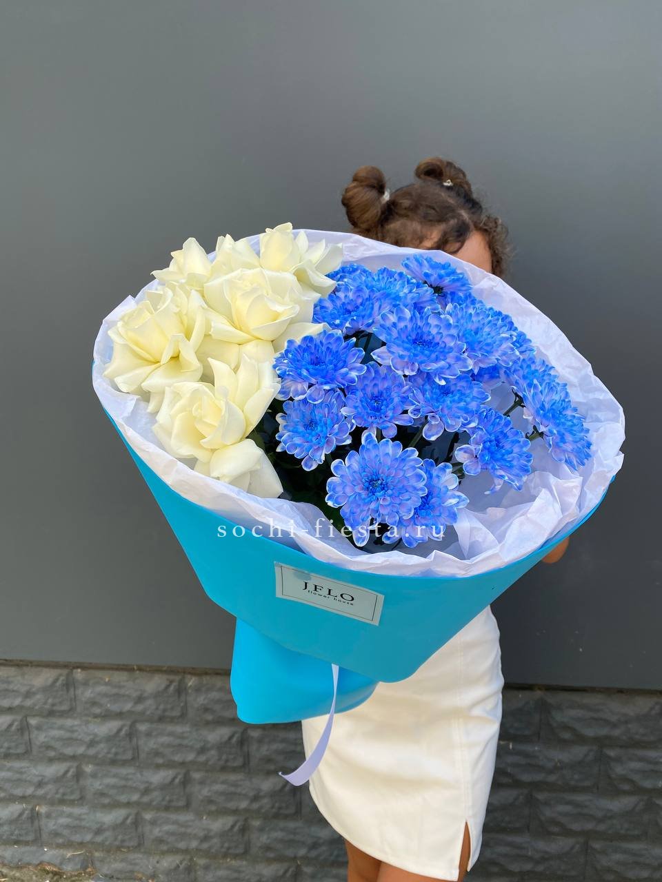гортензия, одноголовые хризантемы, кустовые розы, альстромерии, лента и дизайнерская пленка.