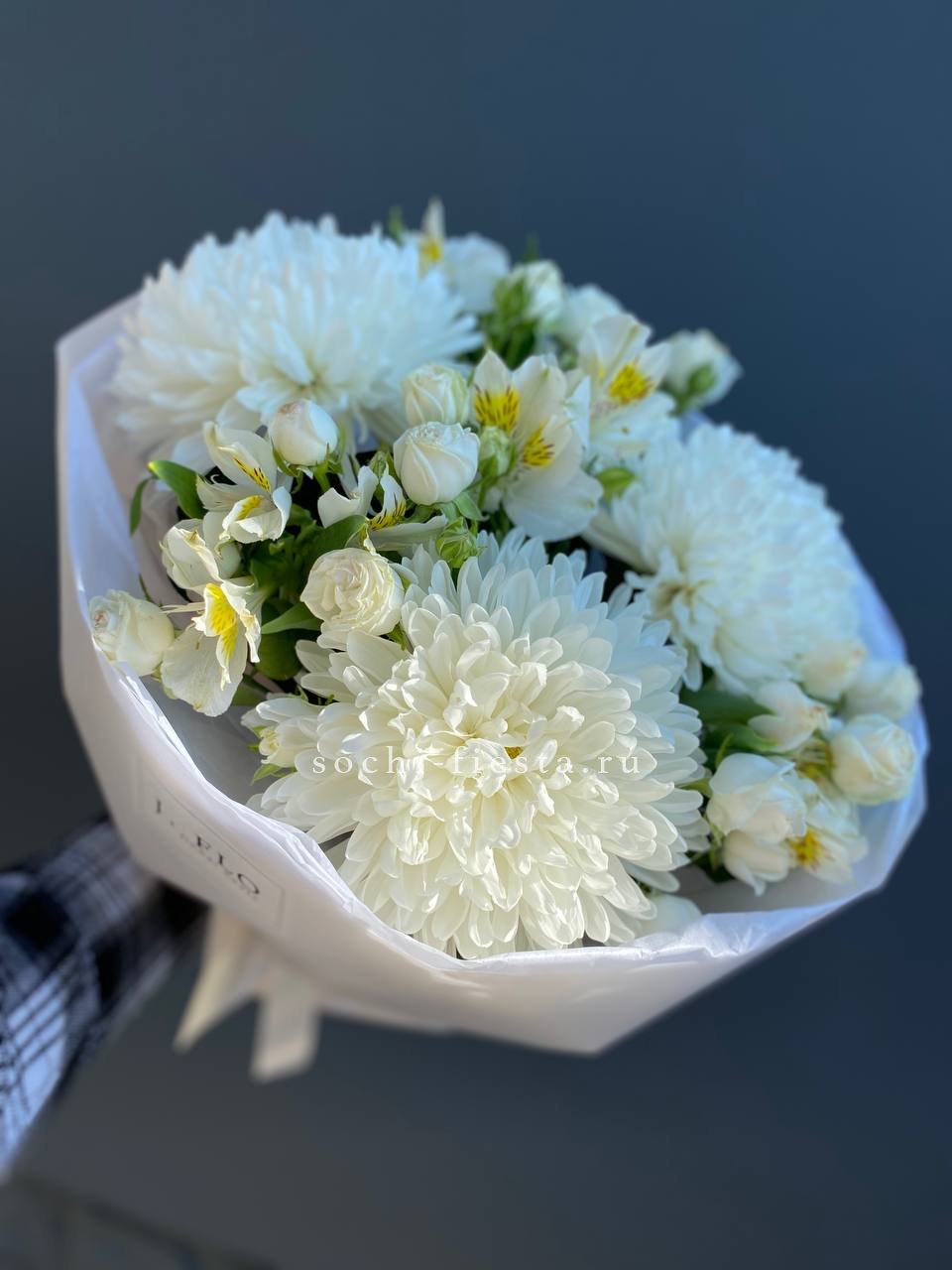 хризантема, кустовые розы, альстромерия, авторское оформление,  лента Возможна замена сезонных цветов.