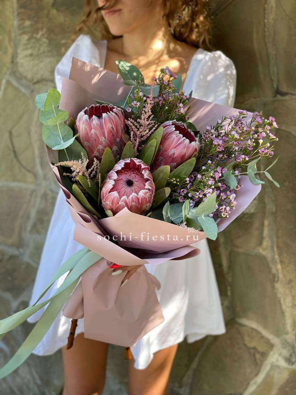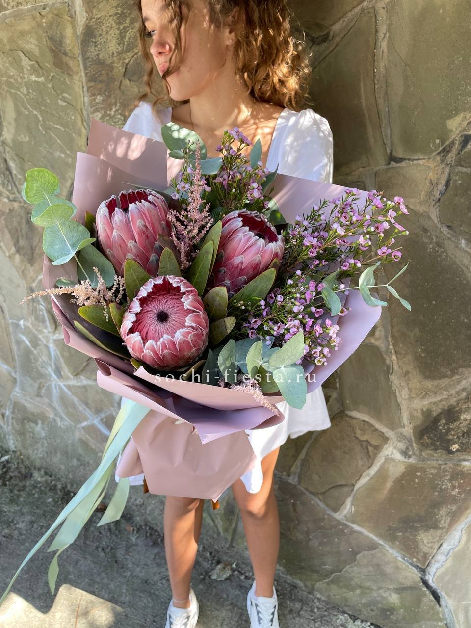 протея, декоративная зелень в зависимости от сезона, антиринум, дизайнерская упаковка.