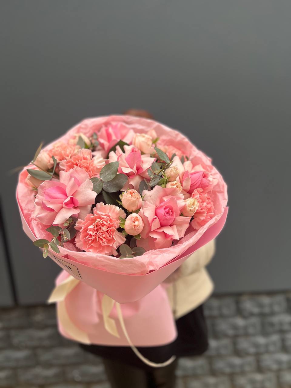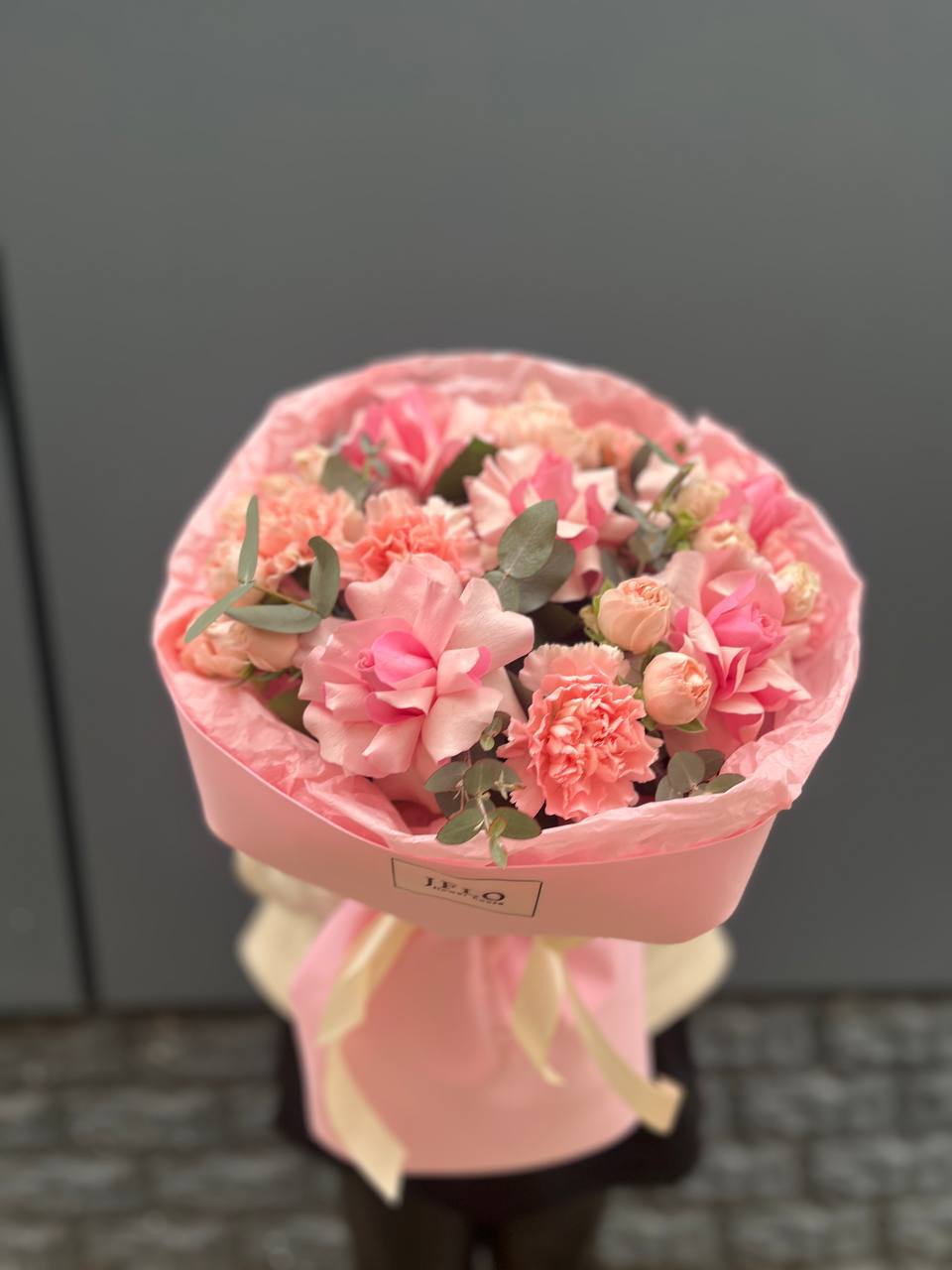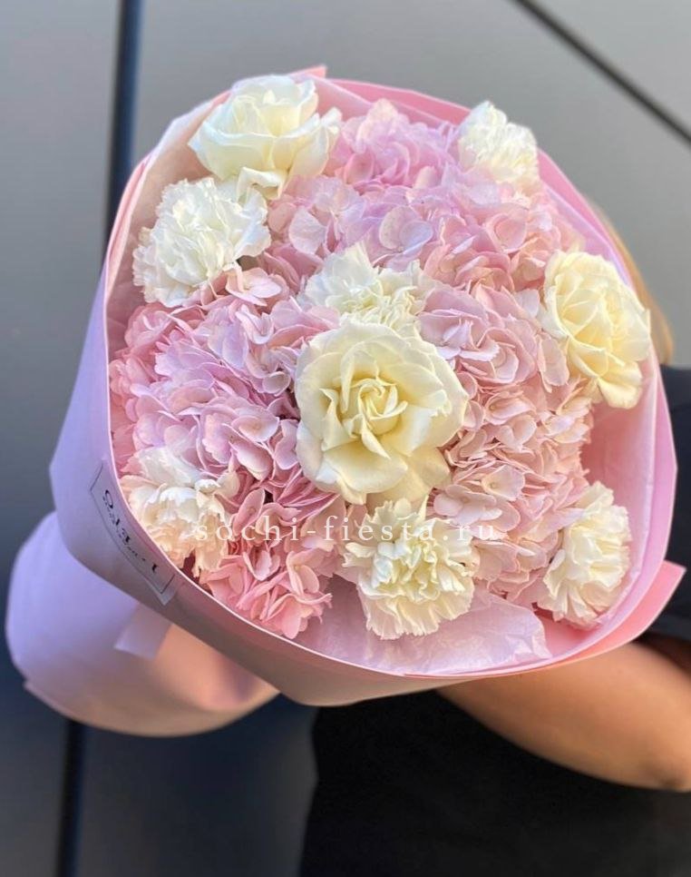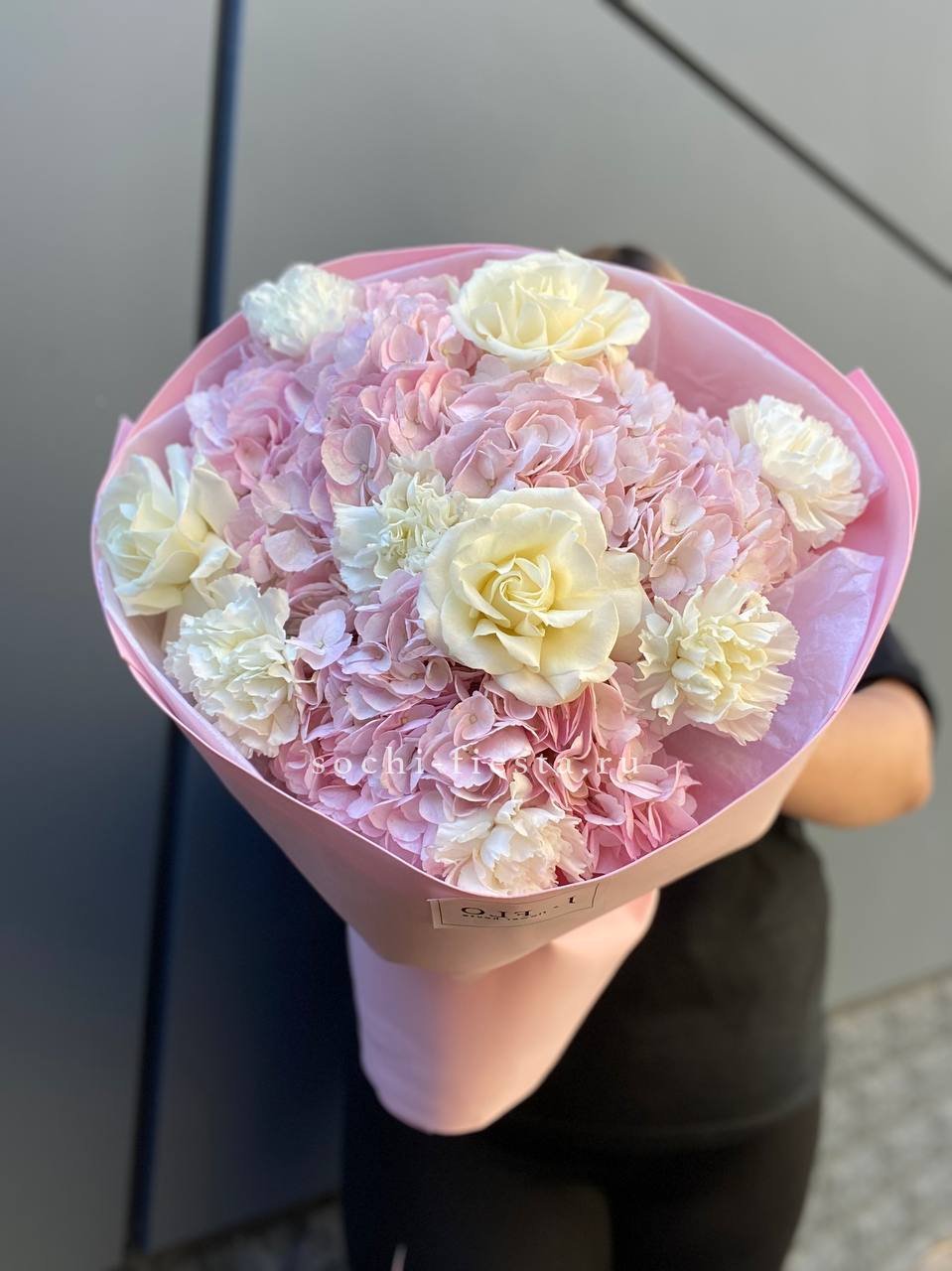Монохромная палитра с многослойной структурой. Французские розы и эустомы чередуются с кустовыми бутонами, гортензии заполняют объём, а диантусы создают точечные акценты. Букет выглядит цельно и графично.
