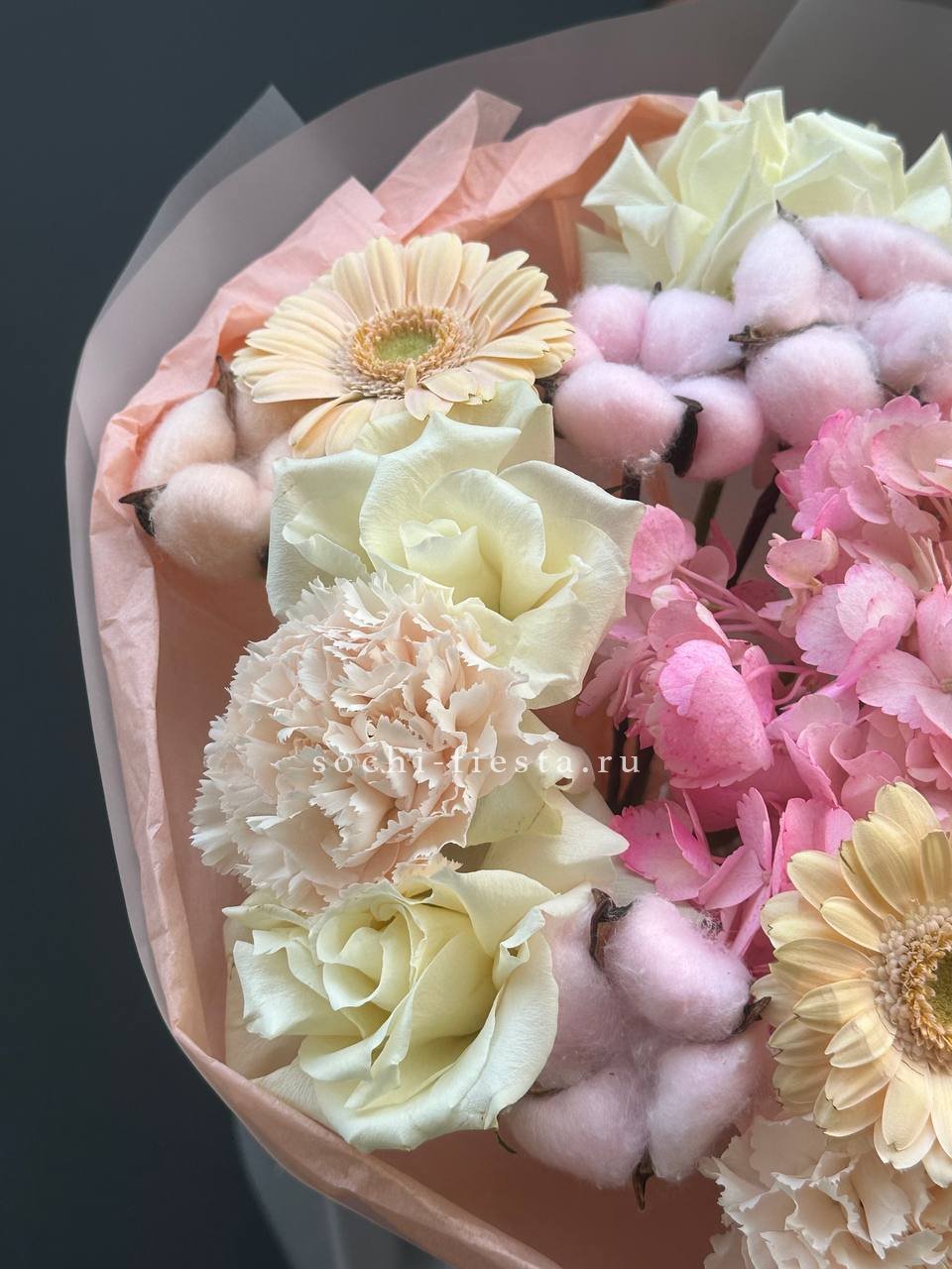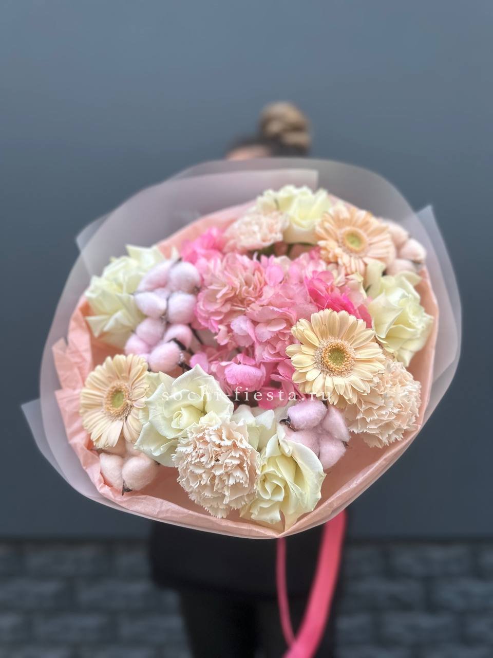 Пушистые соцветия гортензии сливаются с мягким хлопком и формируют объёмное облако. Герберы и диантусы вносят цветовые акценты, а розы завершают романтичную картину.
