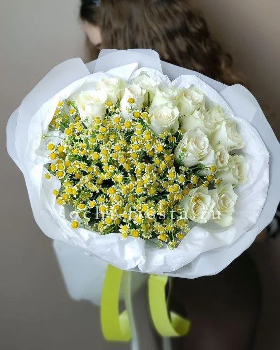 Белоснежные ромашки танацетум камилла образуют воздушное облако вокруг бутонов роз. Свежая композиция с летним характером и легким настроением.
