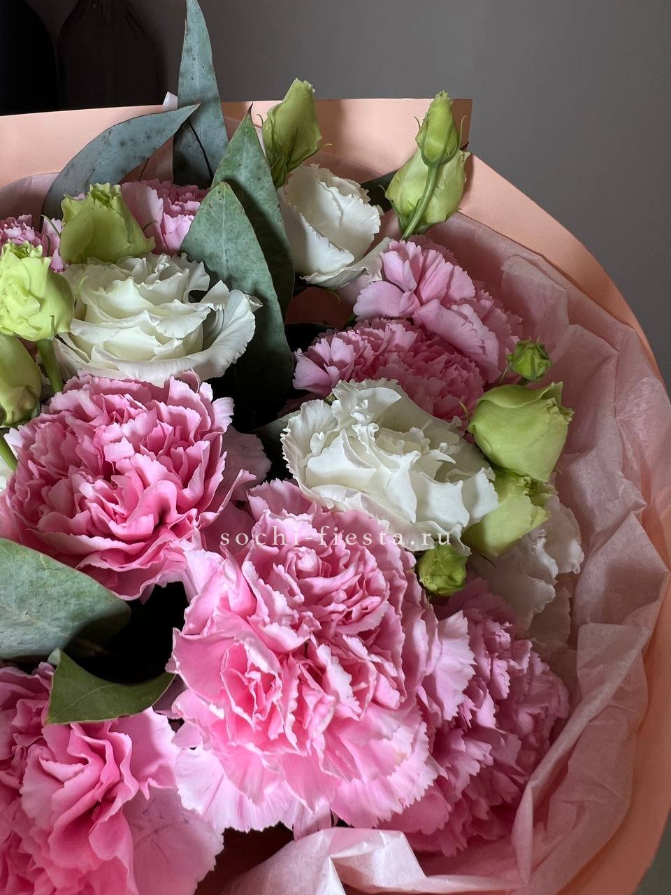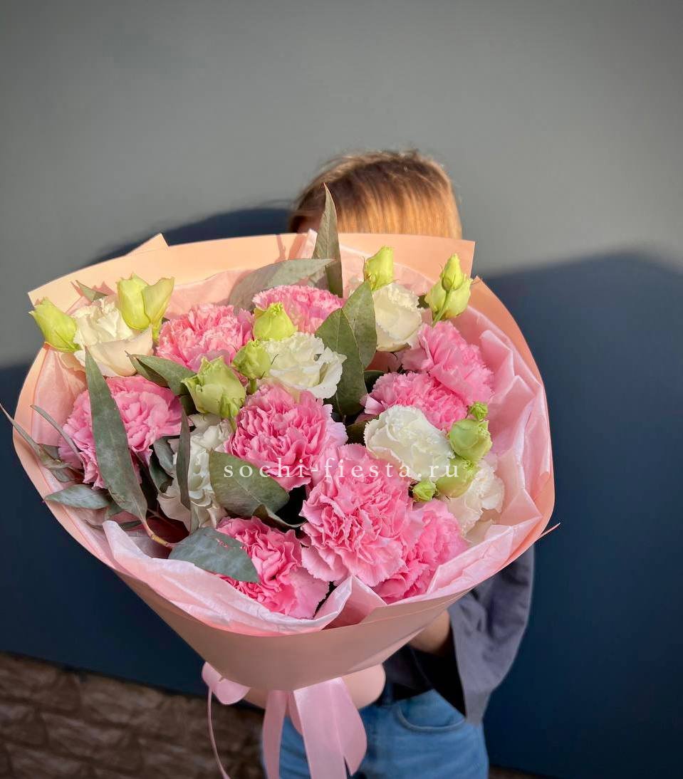 диантус, эустома, гортензия, хайди, эвкалипт, озатамус, пленка.