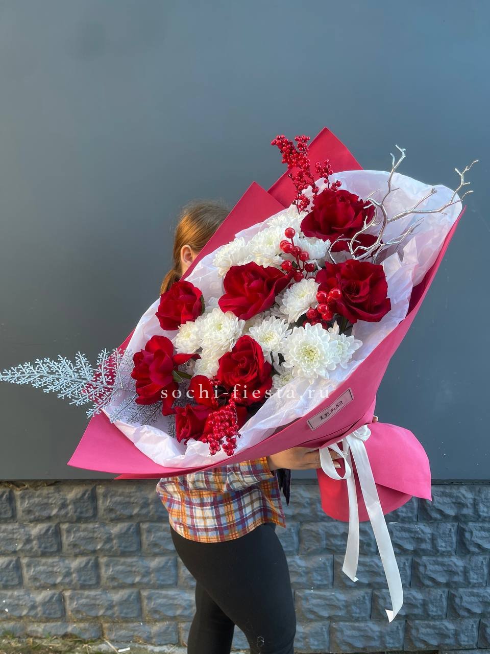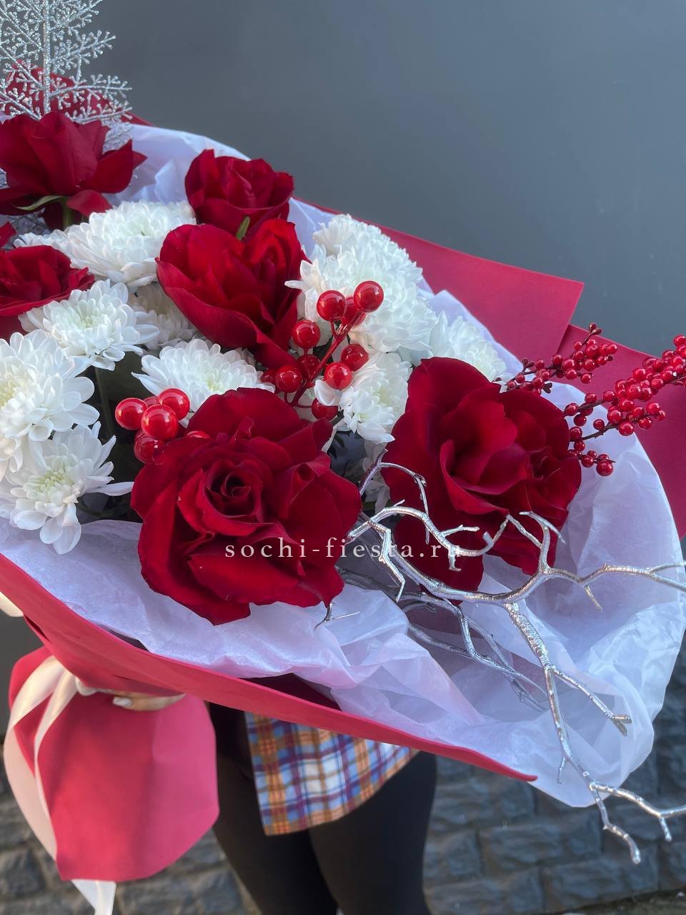 Красные розы и хризантемы звучат ярко и насыщенно в этой зимней композиции. Праздничный декор добавляет настроения, а плотная форма букета создает выразительное присутствие. Для тех моментов, когда нужен цвет и энергия.