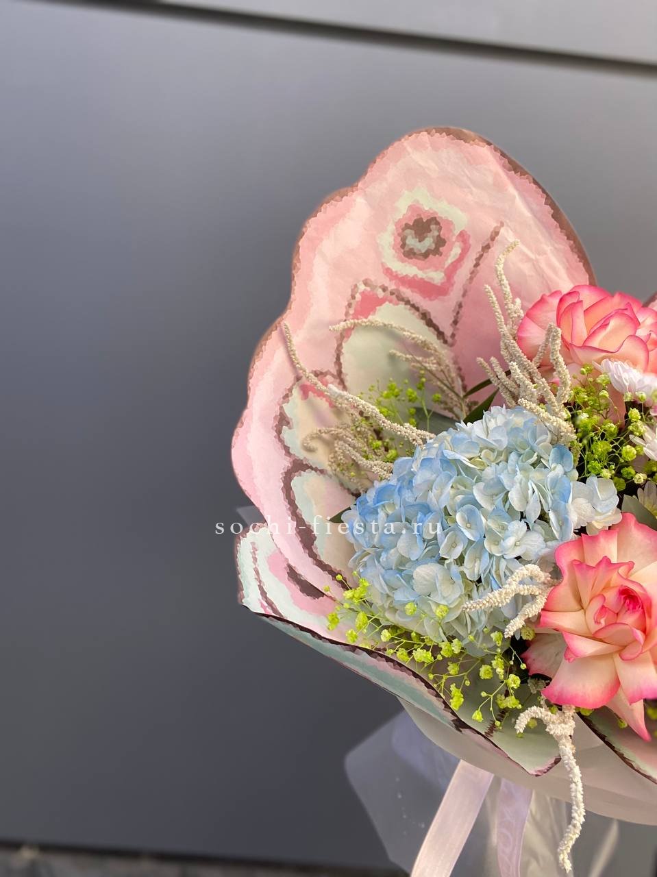 маттиола, диантусы, пионовидные розы Мисти Баблс, эвкалипт, лимониум, эустома лента, упаковка.