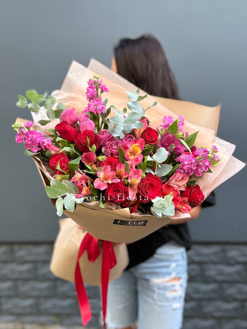 роза одноголовая красная, львиный зев или маттиола, пионовидная кустовая роза, красная и розовая альстромерия, эвкалипт, декоративная зелень, лента, крафт.