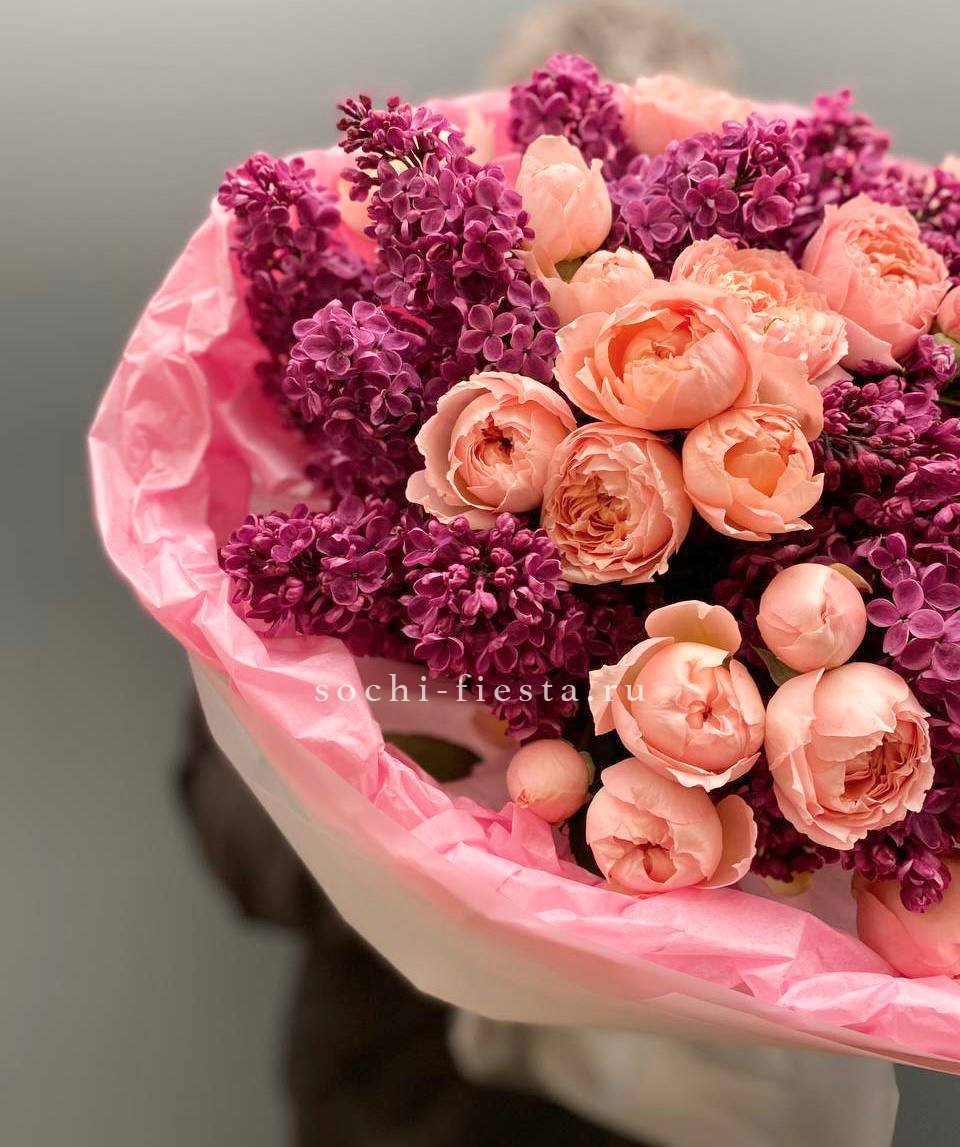 Весенняя встреча сирени и пионовидных кустовых роз в лёгкой упаковке. Ароматный дуэт для тех, кто ценит естественность и простоту.