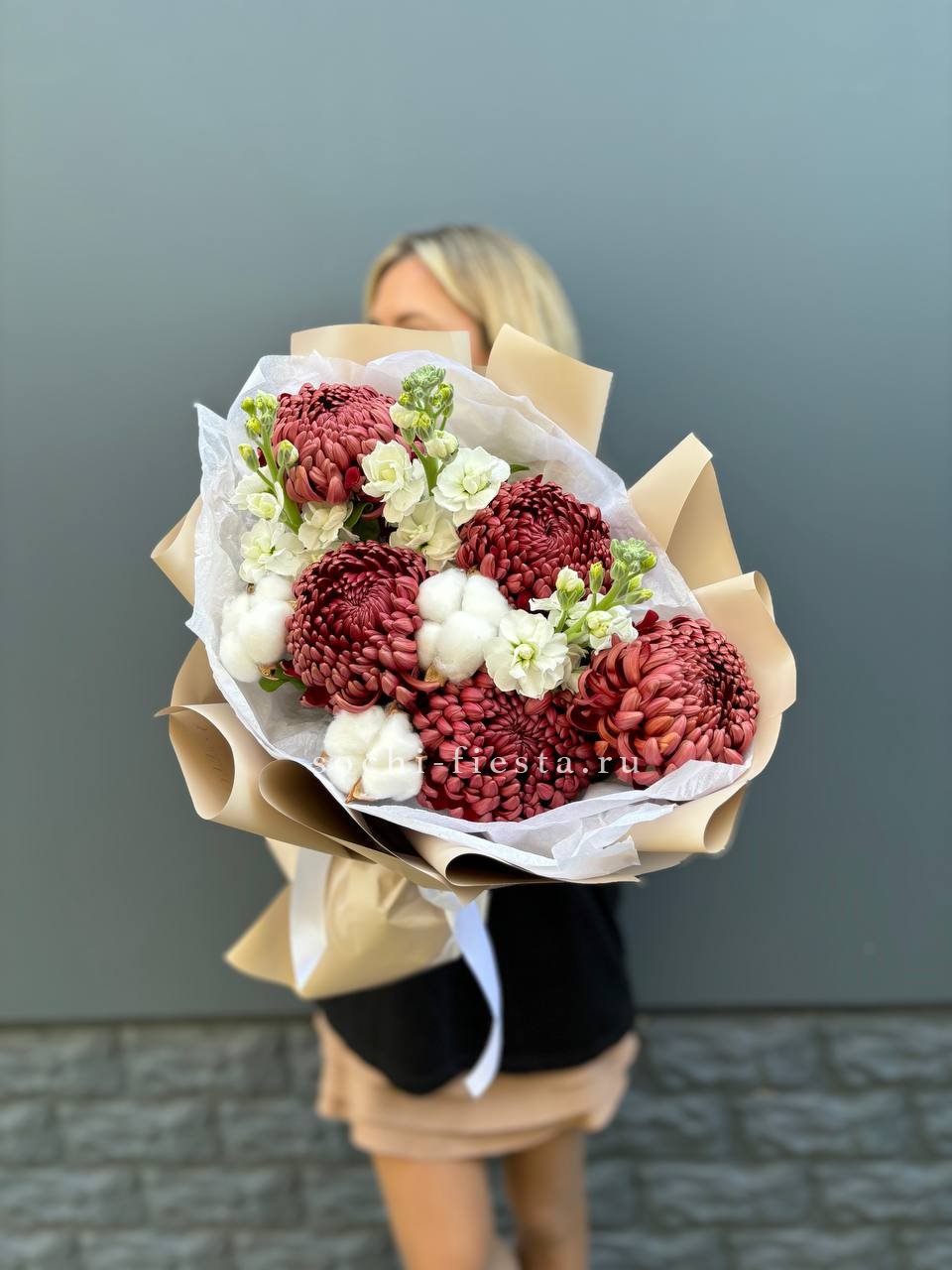 хризантемы, маттиола, лист чика, хлопок, лента, дизайнерская упаковка.