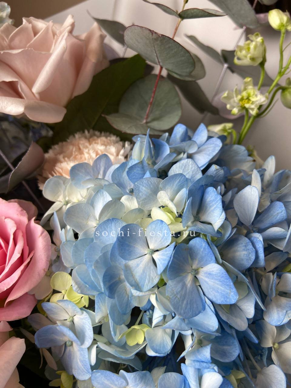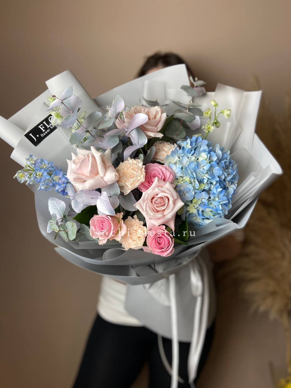гортензия, гербера, диантус, эустома, свит ревиваль, кустовая роза, эвкалипт, лента, корейская пленка.