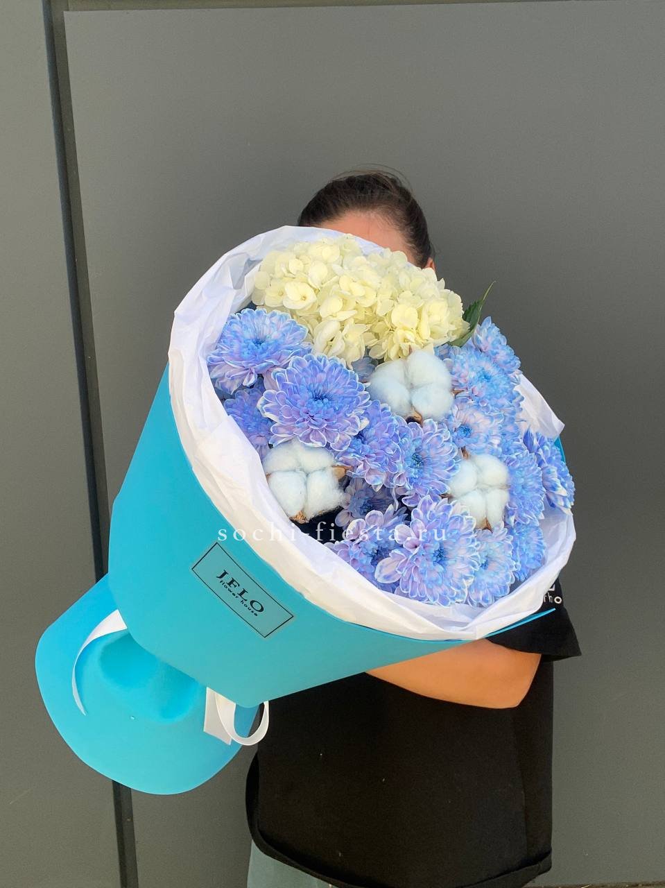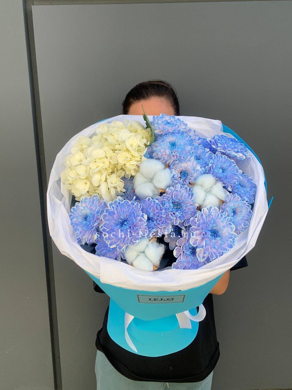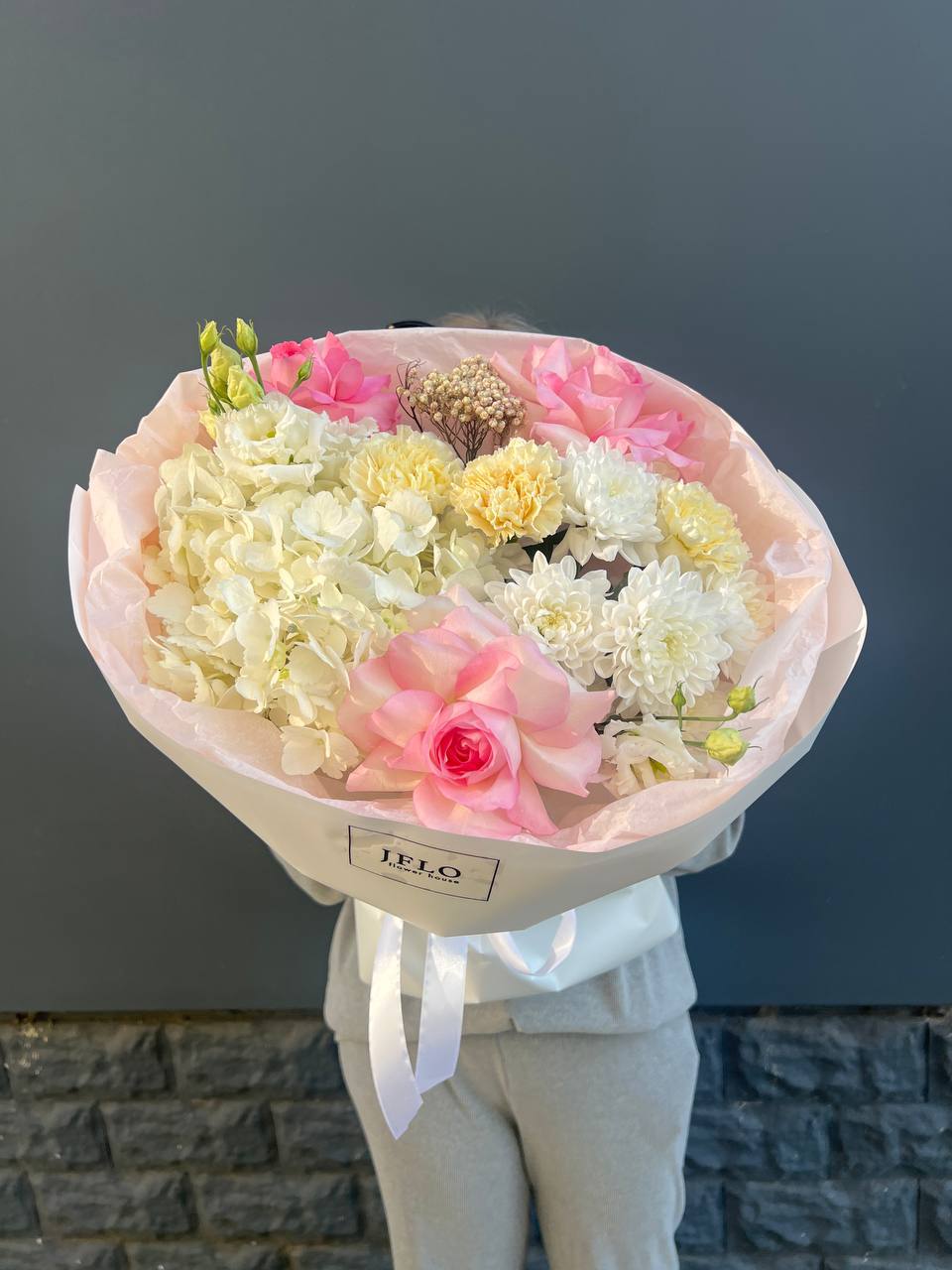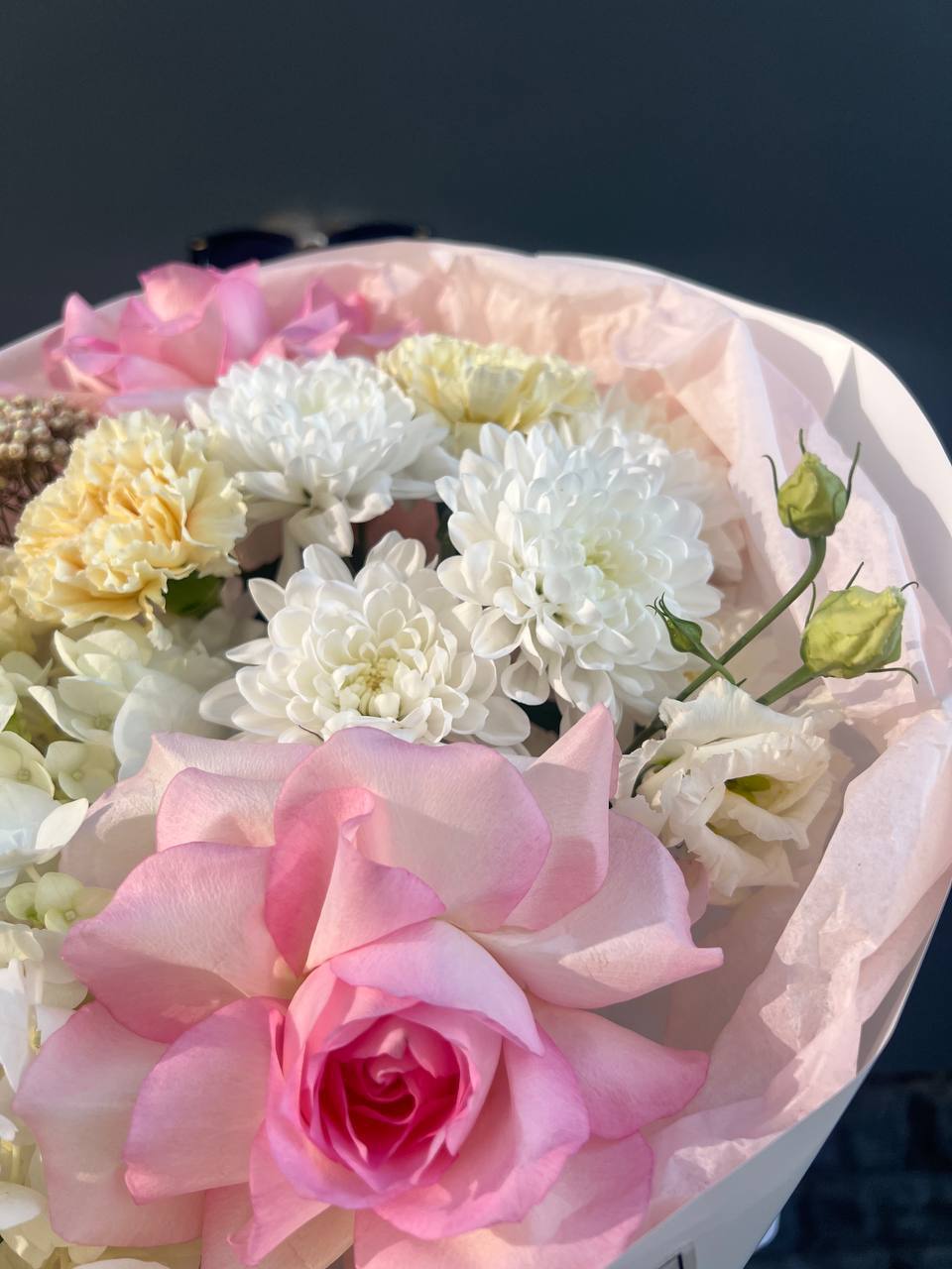 Букет объединяет хризантемы, диантусы, розы, эустому и гортензию в плотную композицию. Корейская пленка удерживает форму и создает графичный силуэт с четкими границами.