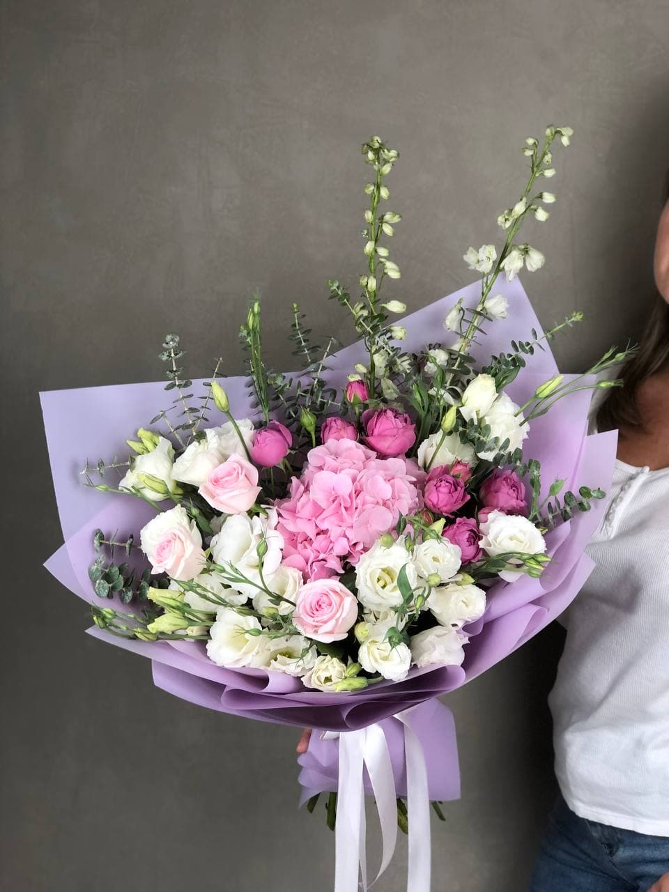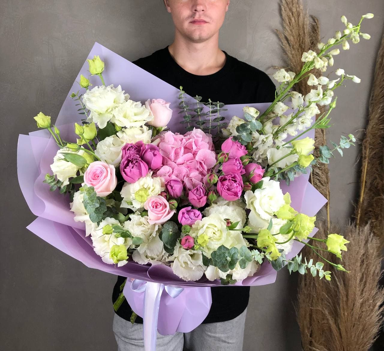 гортензия, эустома, кустовые розы, одноголовые розы, эвкалипт, вспомогательная зелень.