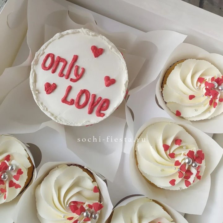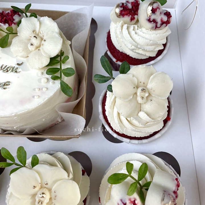 • Подарочный сет — торт, капкейки, букет и открытка в единой праздничной упаковке.