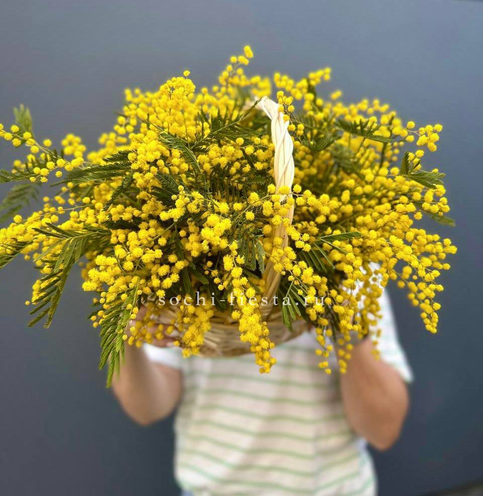 Солнечные шары мимозы собраны в пышную корзину. Яркий жёлтый цвет мгновенно поднимает настроение и напоминает о первых тёплых днях.